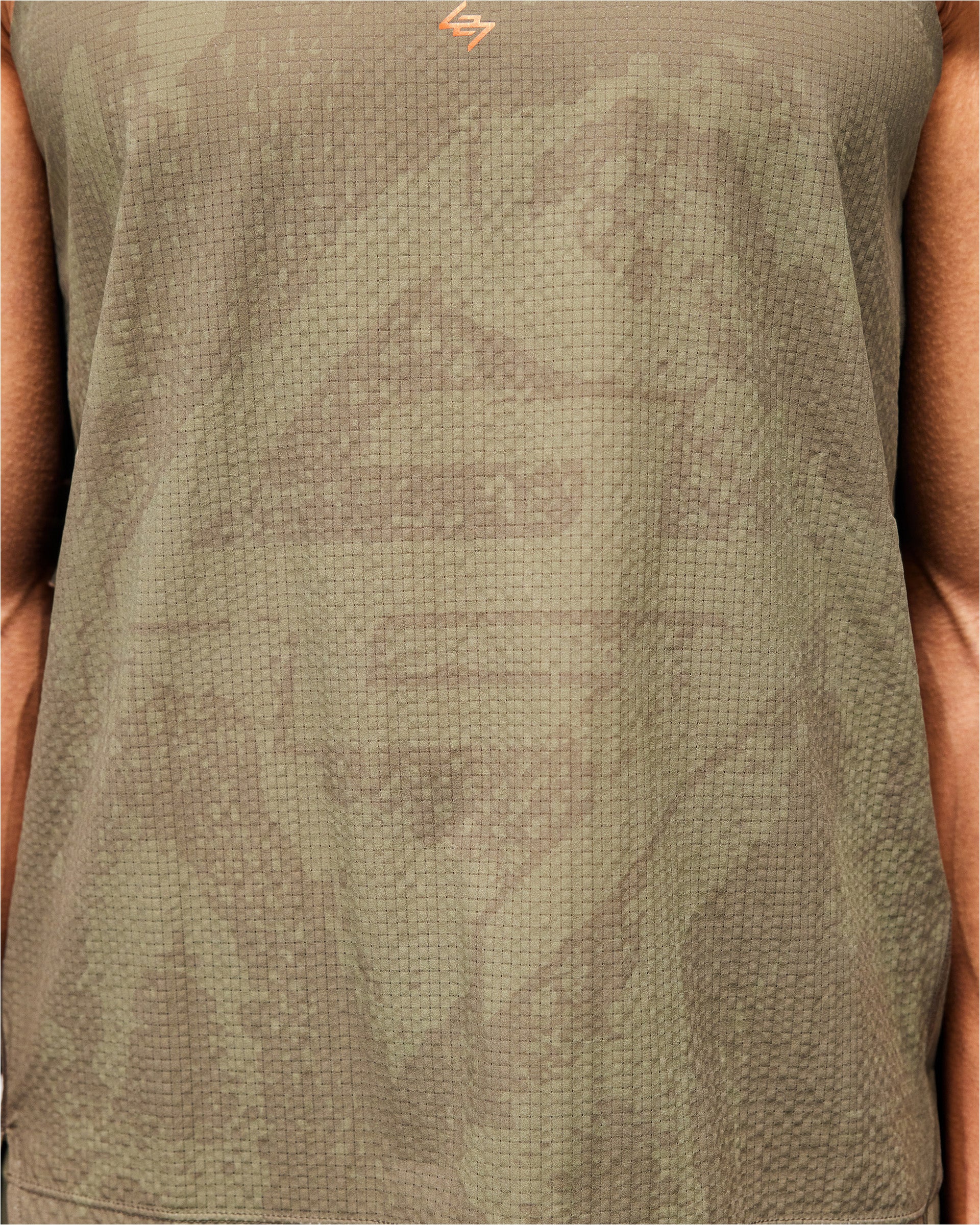 Introducing the 247 Los Angeles Singlet. Built for distance running in high temperatures, this lightweight racerback singlet is constructed from perforated mesh fabric with a tonal printed finish across the collection's signature pattern. The scooped neckline and side splits deliver unrestricted movement and maximum airflow, finished with an orange 247 logo at the chest.
