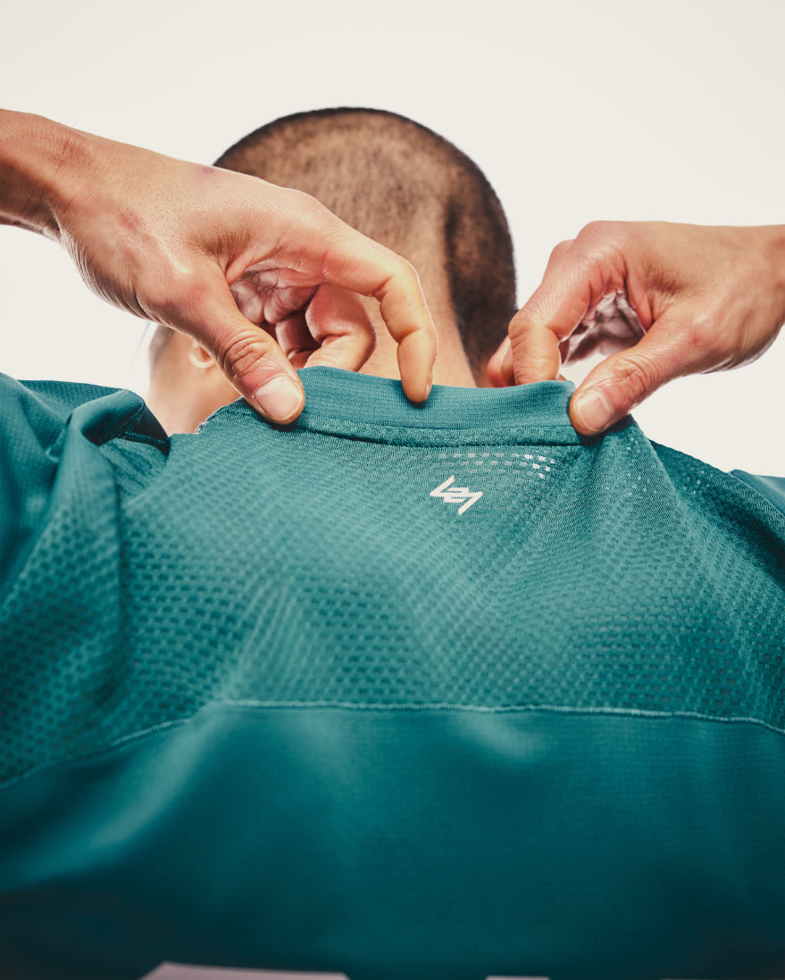 - Contrast mesh panelling to underarm gusset and back yoke for zoned breathability
