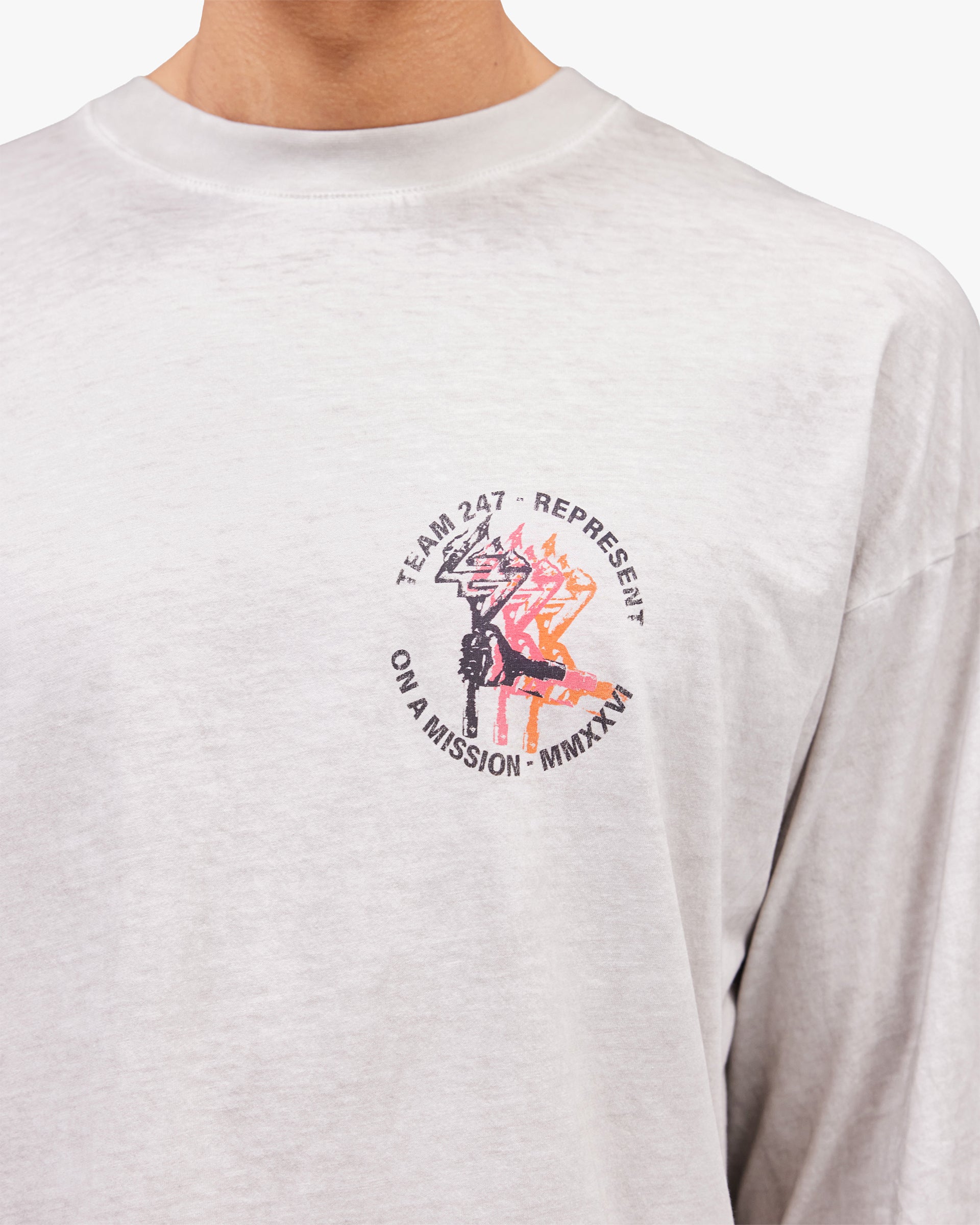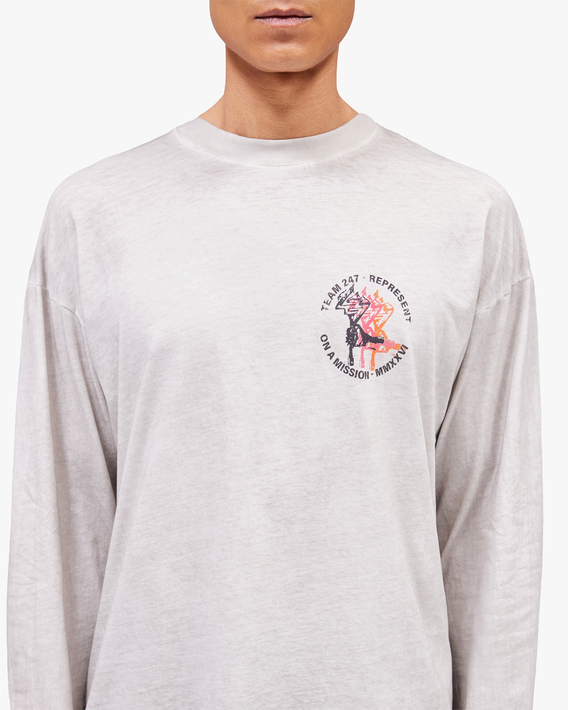 Introducing the 247 Torch Crop Long Sleeve in Bleach Wash. Cut in a boxy cropped fit from cotton slub fabric with a distressed bleach wash finish, the Torch collection references vintage athletics with a modern edge. The torch graphic pays homage to a golden era of American track and field, reimagined for the modern athlete.