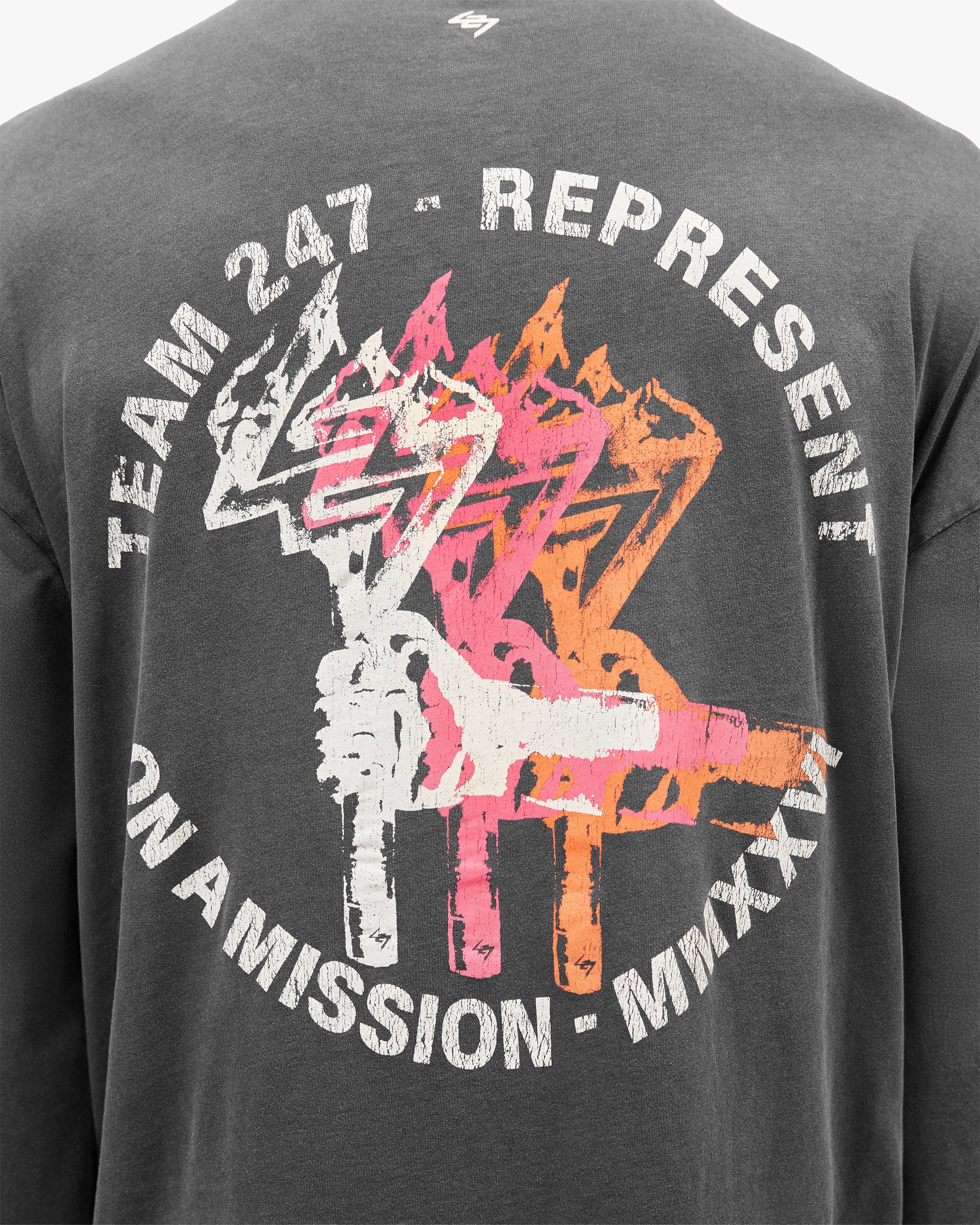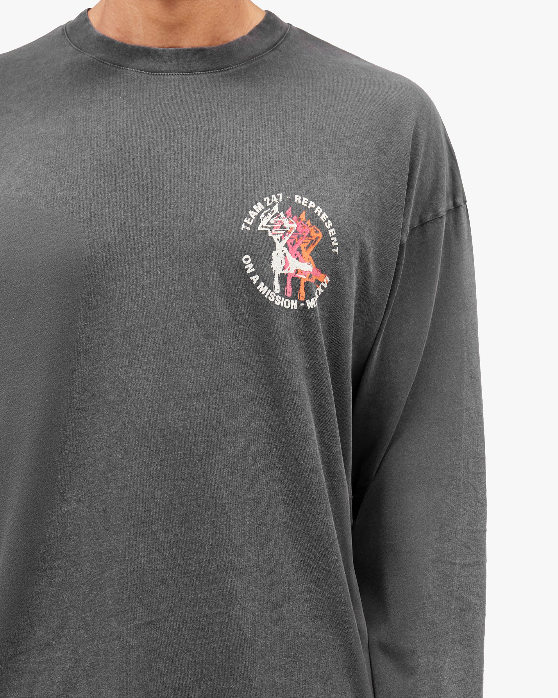 Introducing the 247 Torch Crop Long Sleeve in Washed Black. Cut in a boxy cropped fit from cotton slub fabric with a distressed wash finish, the Torch collection references vintage athletics with a modern edge. The torch graphic pays homage to a golden era of American track and field, reimagined for the modern athlete.