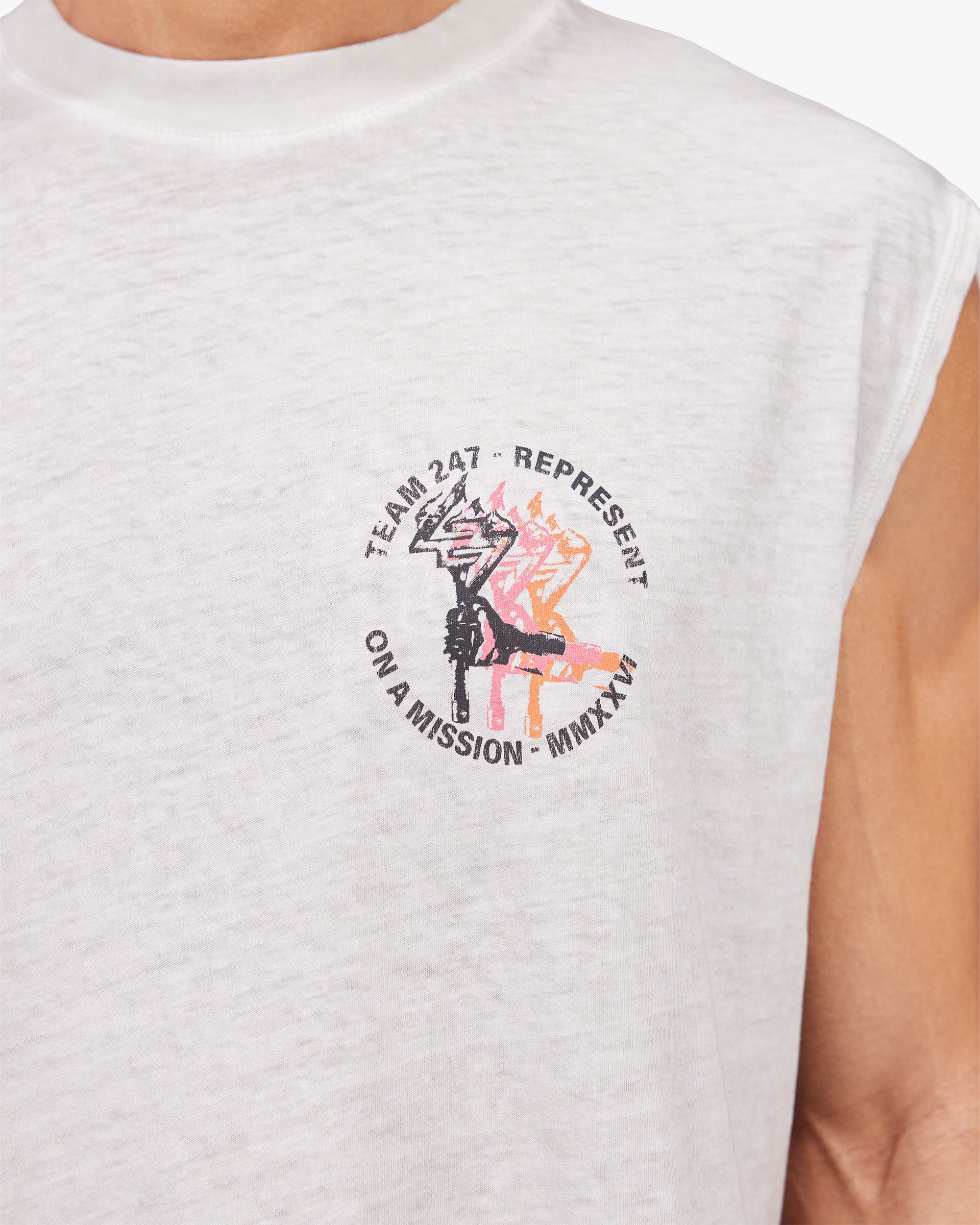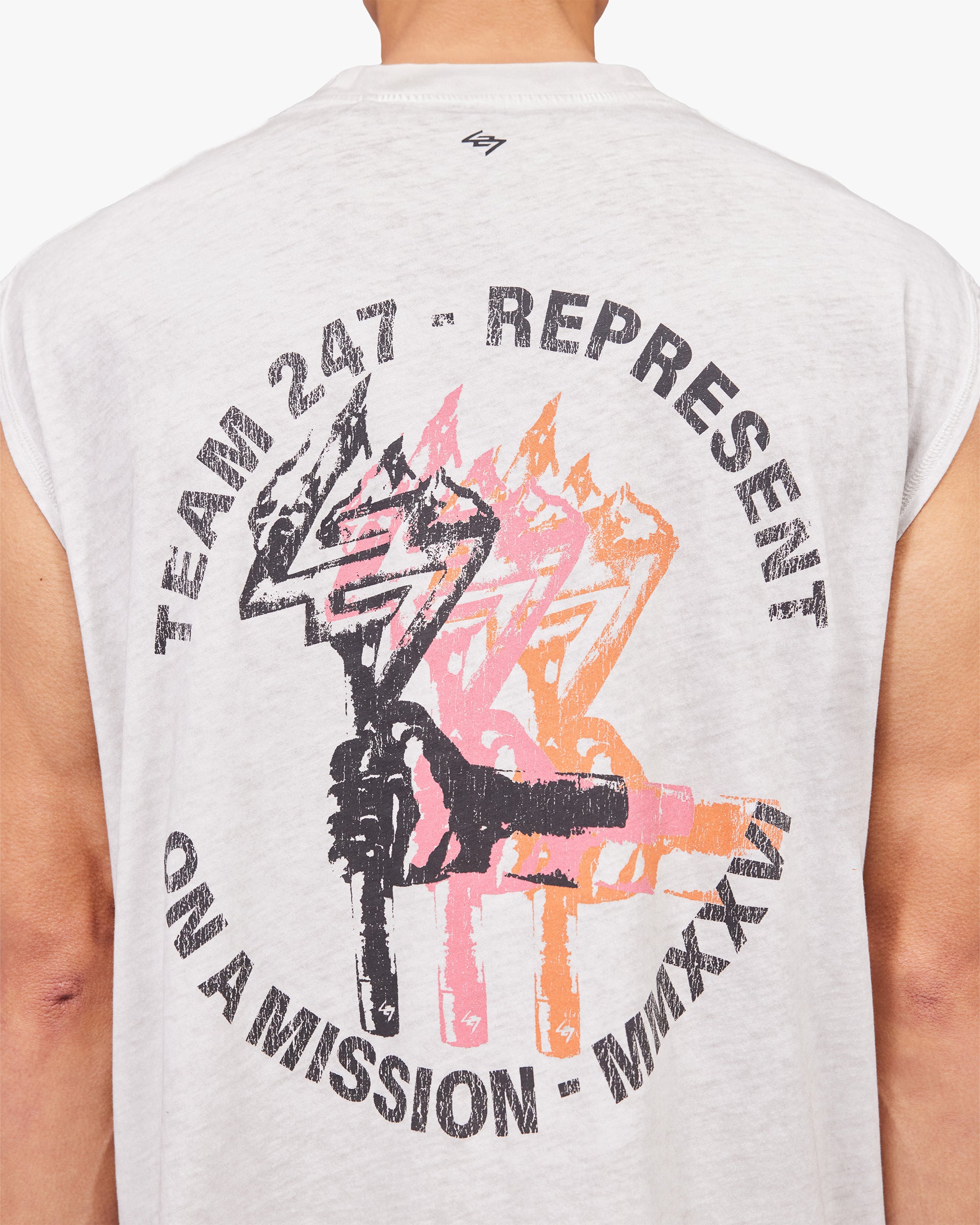 Introducing the 247 Torch Crop Tank in Bleach Wash. Cut in a boxy cropped fit from cotton slub fabric with a distressed bleach wash finish, the Torch collection references vintage athletics with a modern edge. The torch graphic pays homage to a golden era of American track and field, reimagined for the modern athlete.