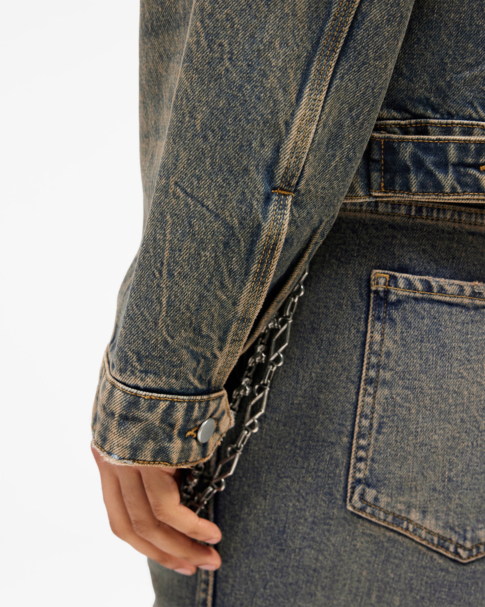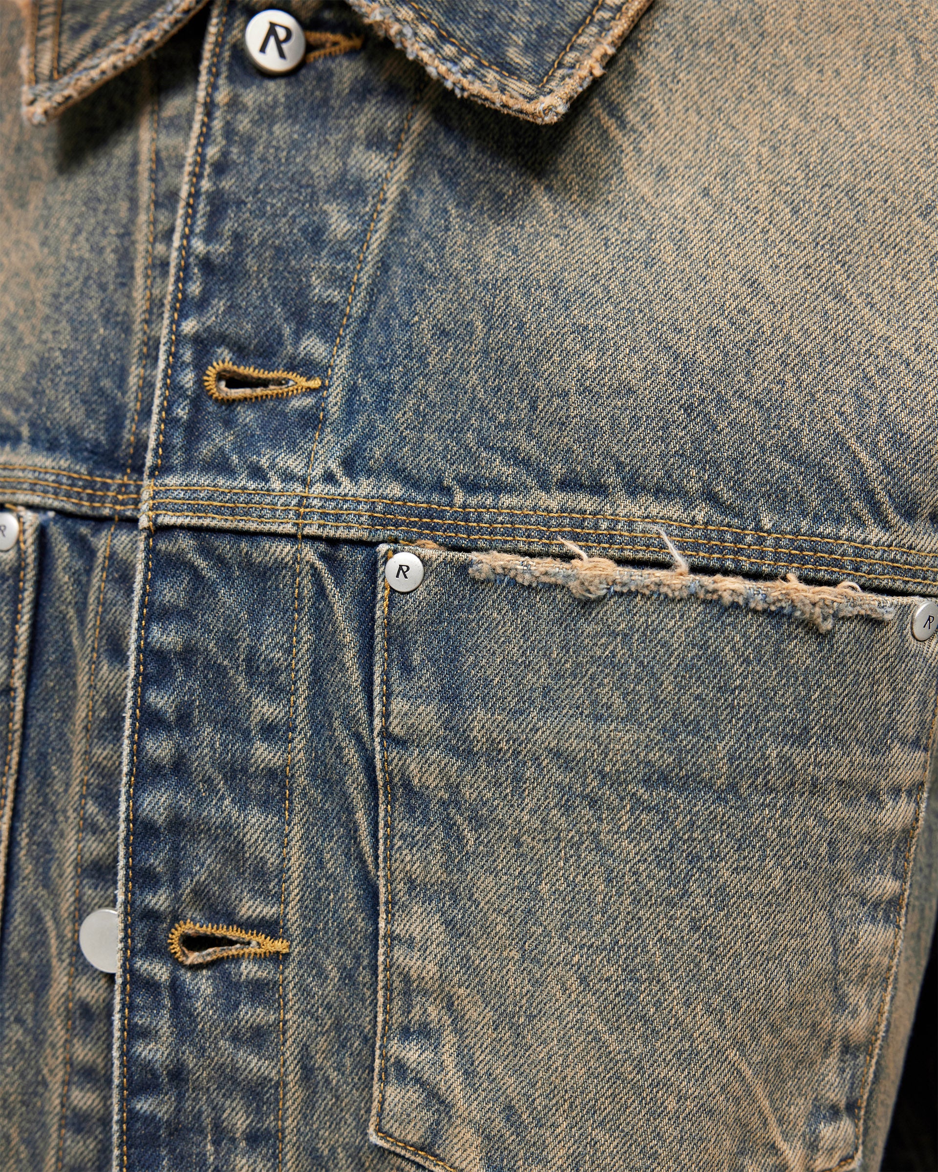 Introducing the Denim Trucker in Blue Cream, a classic trucker jacket crafted from rigid cotton denim with a heavily distressed vintage wash. The two-tone blue and cream finish is developed through intensive washing to create a naturally aged, worn-in character that will continue to develop over time.