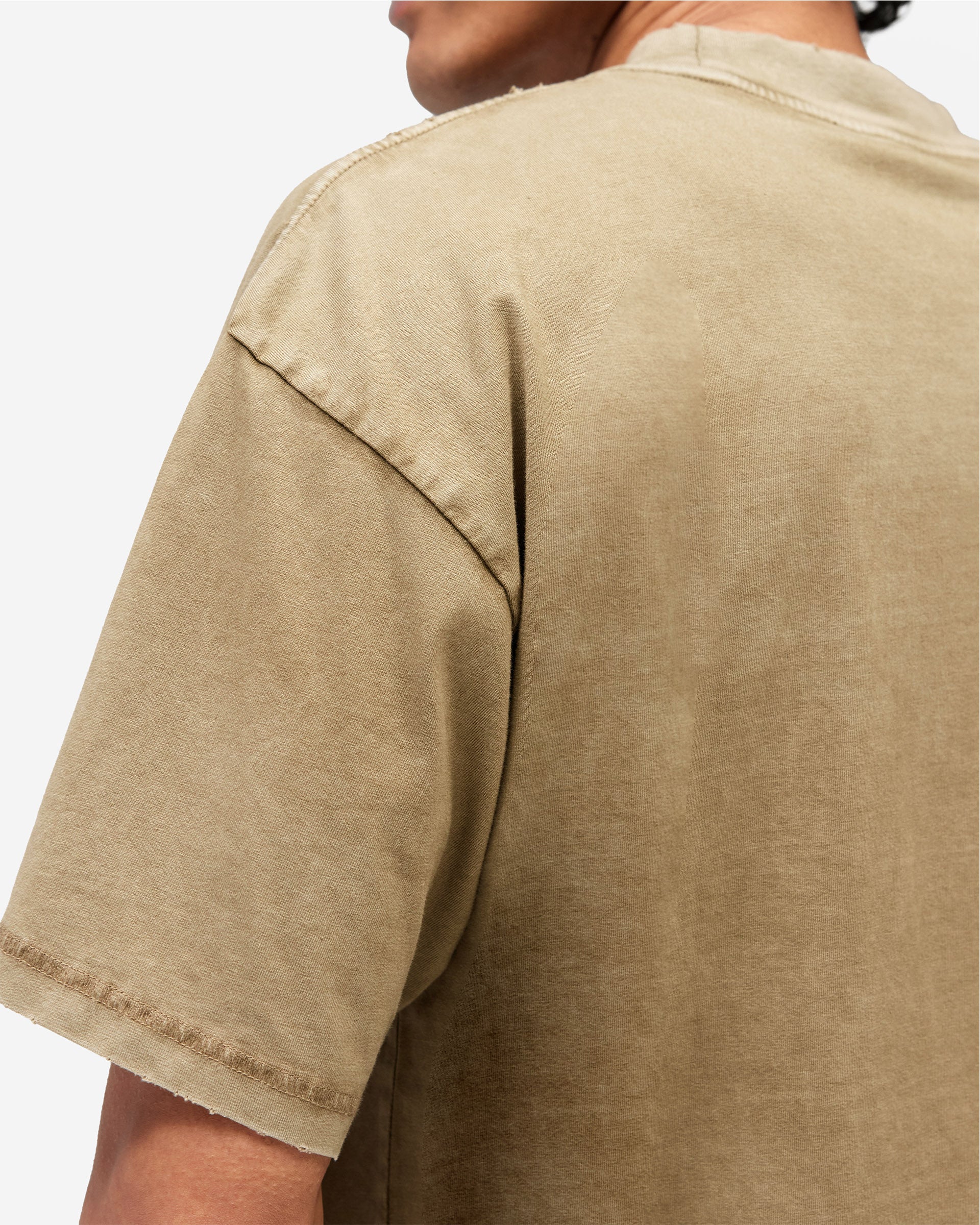 Introducing the Embellished Represent T-Shirt in Vintage Khaki, an oversized t-shirt crafted from heavyweight cotton jersey with a washed vintage finish. The front features the arched Represent logo rendered in individual metal claw studs, sitting tonal against the khaki base for a subtle, textured effect.