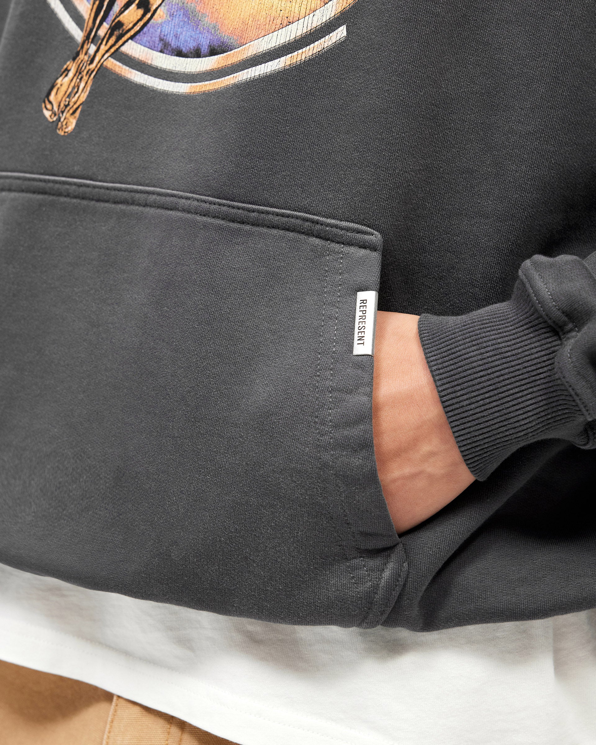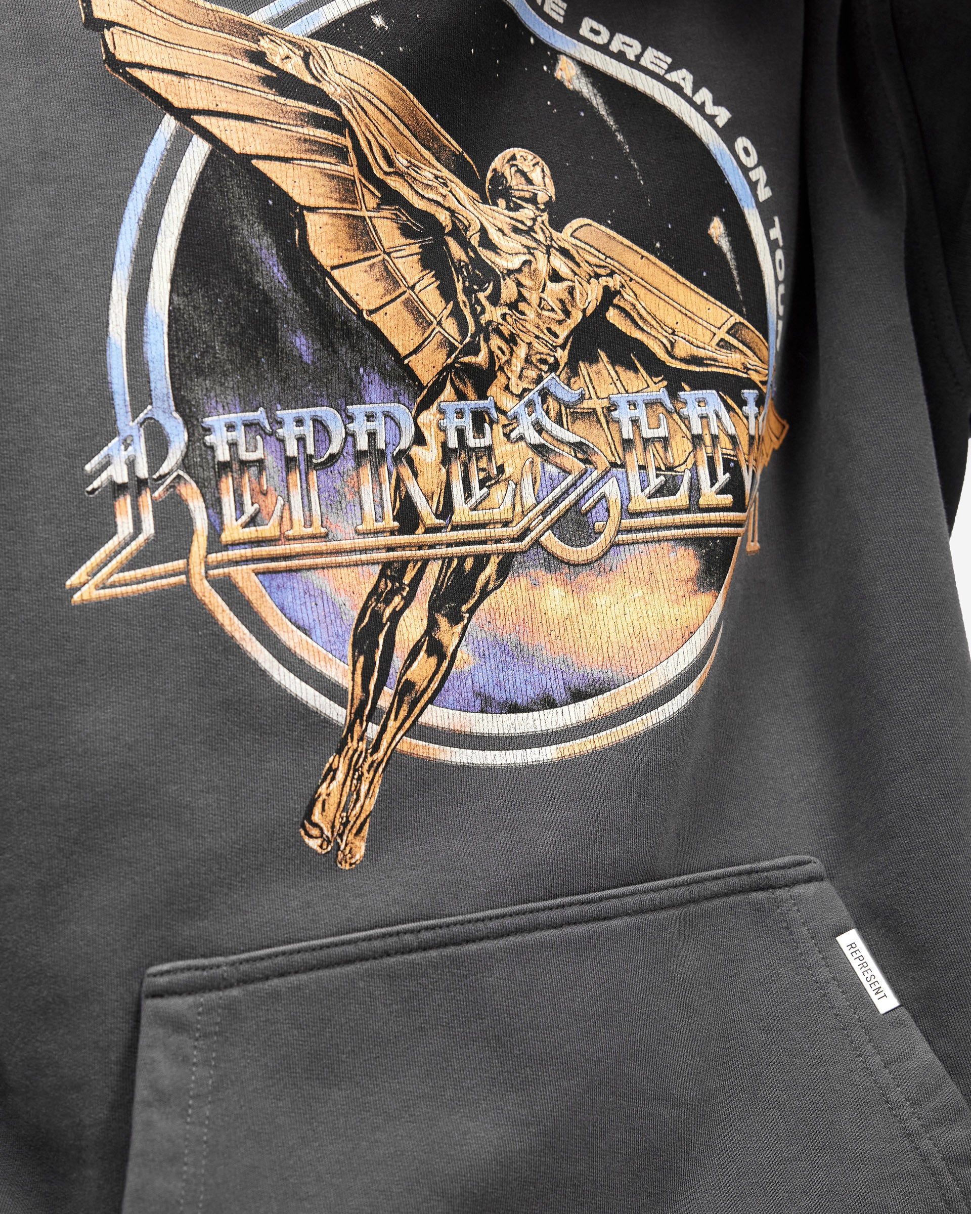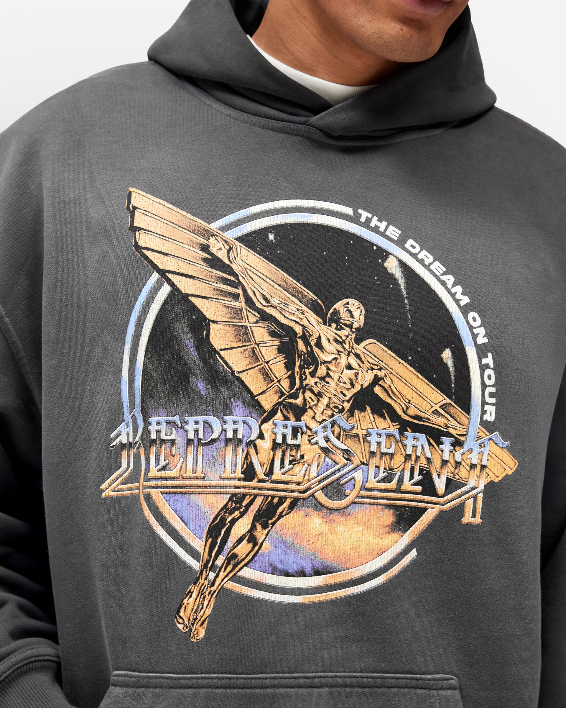 Introducing the Golden Tour Hoodie in Sun Fade Grey, an oversized hoodie crafted from heavyweight cotton jersey with a sun faded finish. The front features a winged angel graphic set within a circular Dream On Tour frame, finished with the Represent logo in a rock-inspired typeface below.
