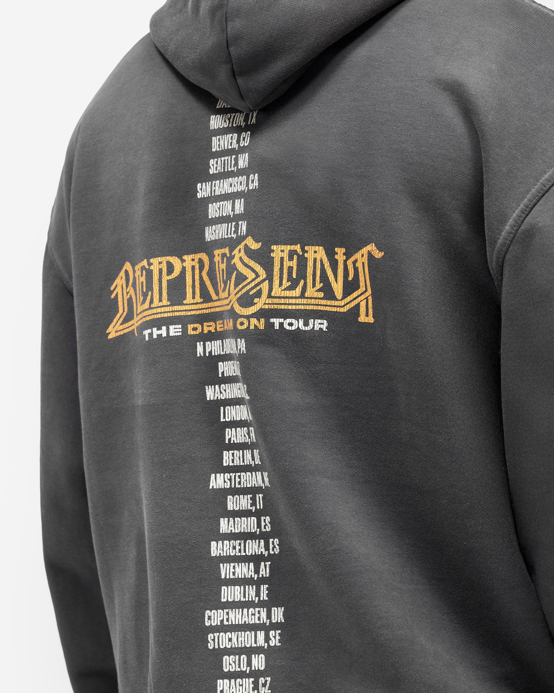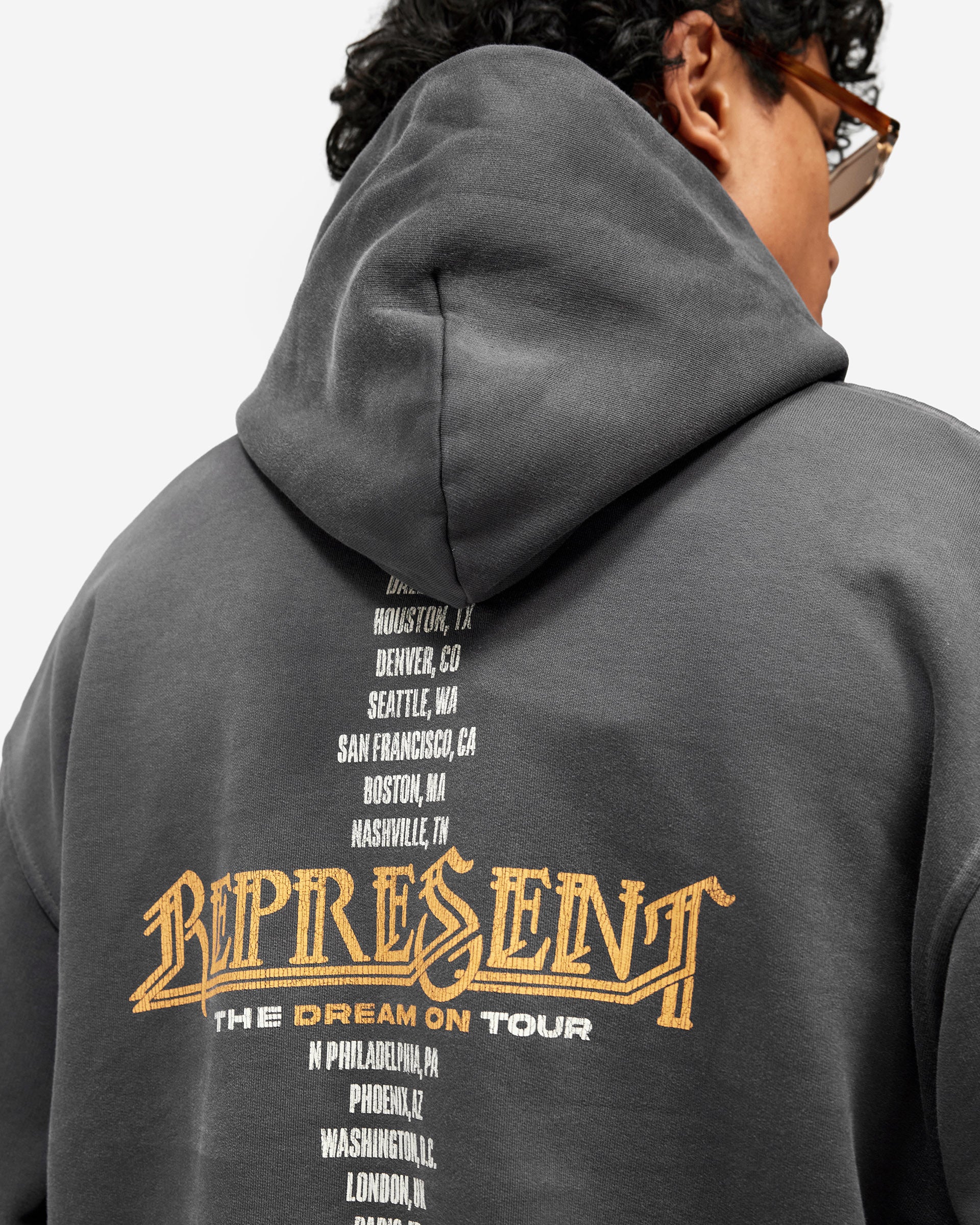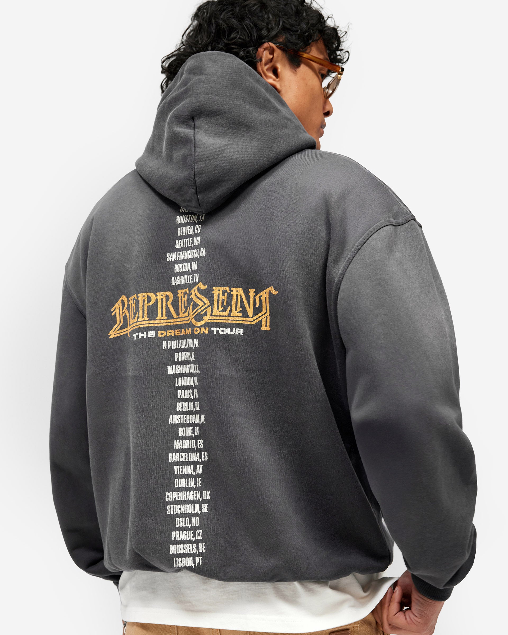 The reverse carries a cross motif built from tour dates spanning cities across America and Europe, centred around the Represent logo and Dream On Tour branding. Finished with a drawcord hood, kangaroo pocket, ribbed cuffs and an elasticated hem.