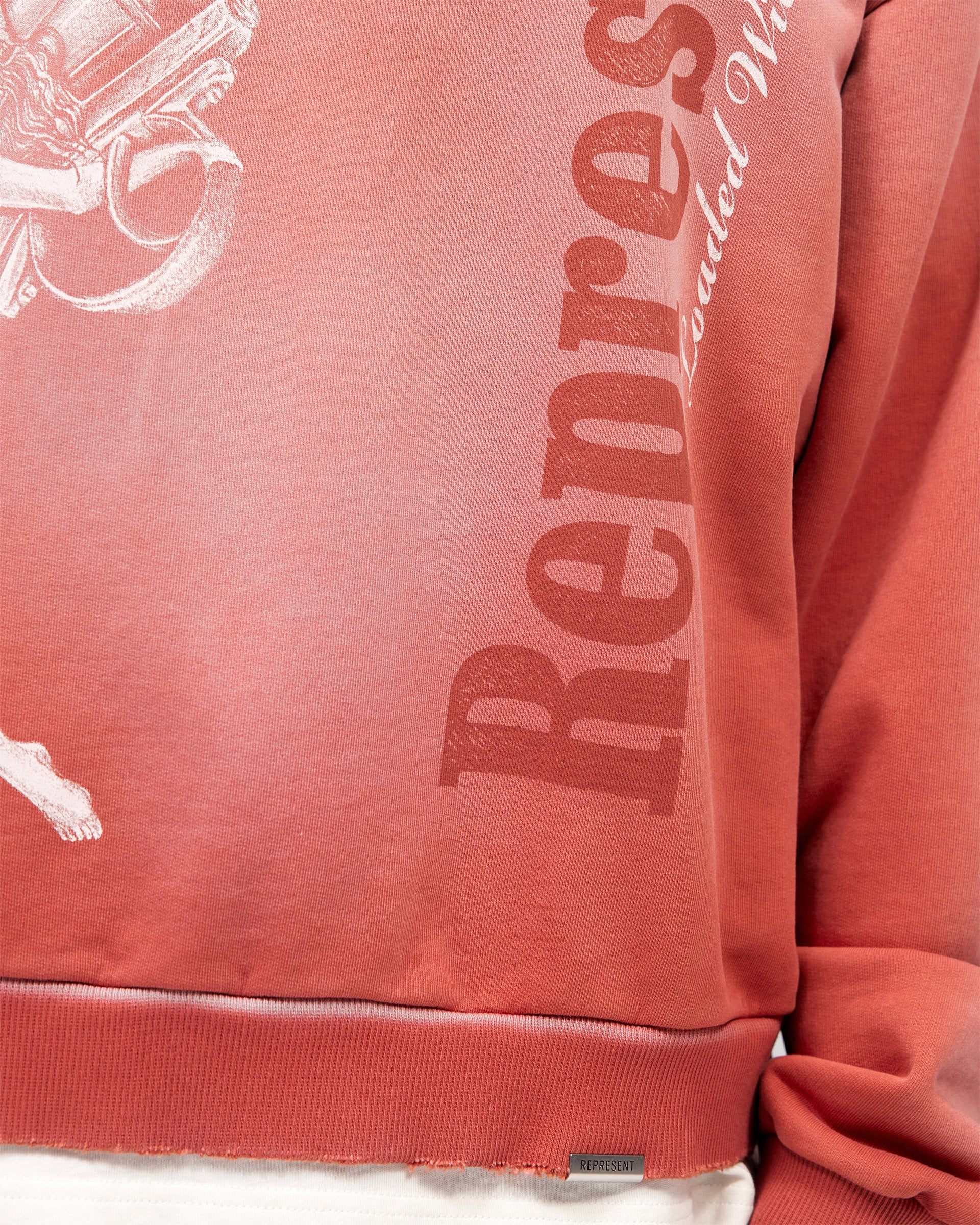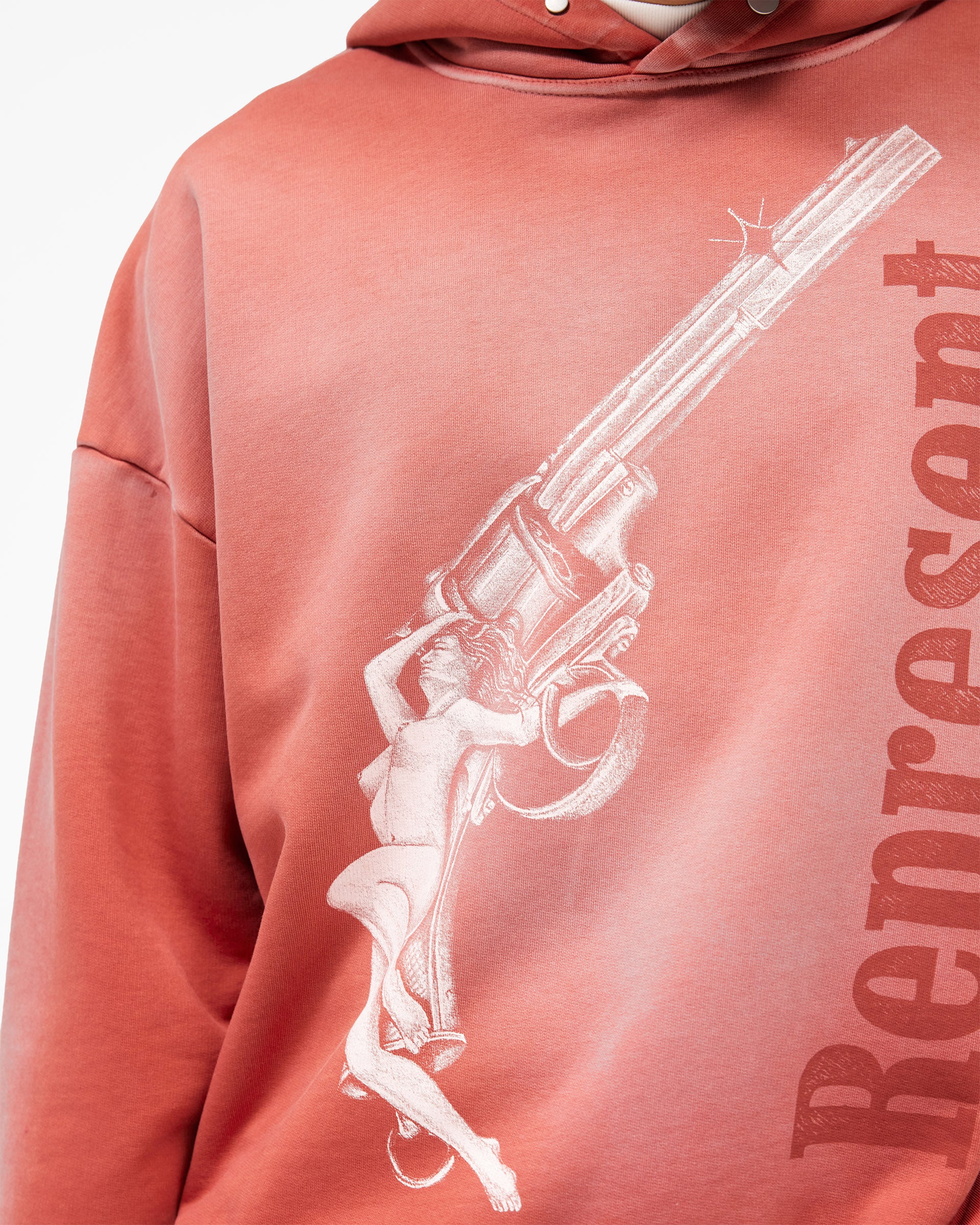 Introducing the Loaded With Love Hoodie in Withered Rose, a boxy essential built for longevity and understated presence. Crafted from substantial 485GSM cotton, this hoodie arrives with signature Represent detailing: a metal bar sits at the hem, a front graphic marks the chest, and minimal distressing softens the cuff and hem. The marriage of comfort and considered design makes this a foundational piece for the season.
