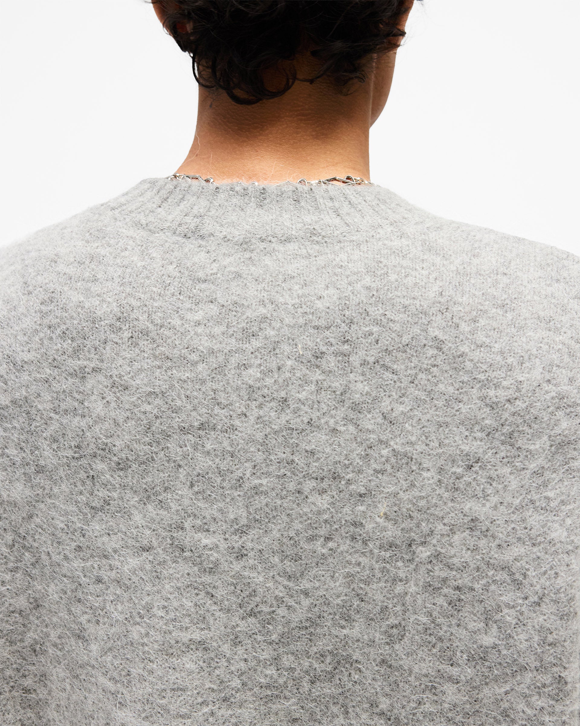Introducing the Logo Knit Sweater in Grey, a relaxed crew neck sweater crafted from a brushed knit yarn with a soft, textured hand-feel. The intarsia knit Represent initial sits in a contrast white tone to the left chest, adding a clean branding detail against the grey base.