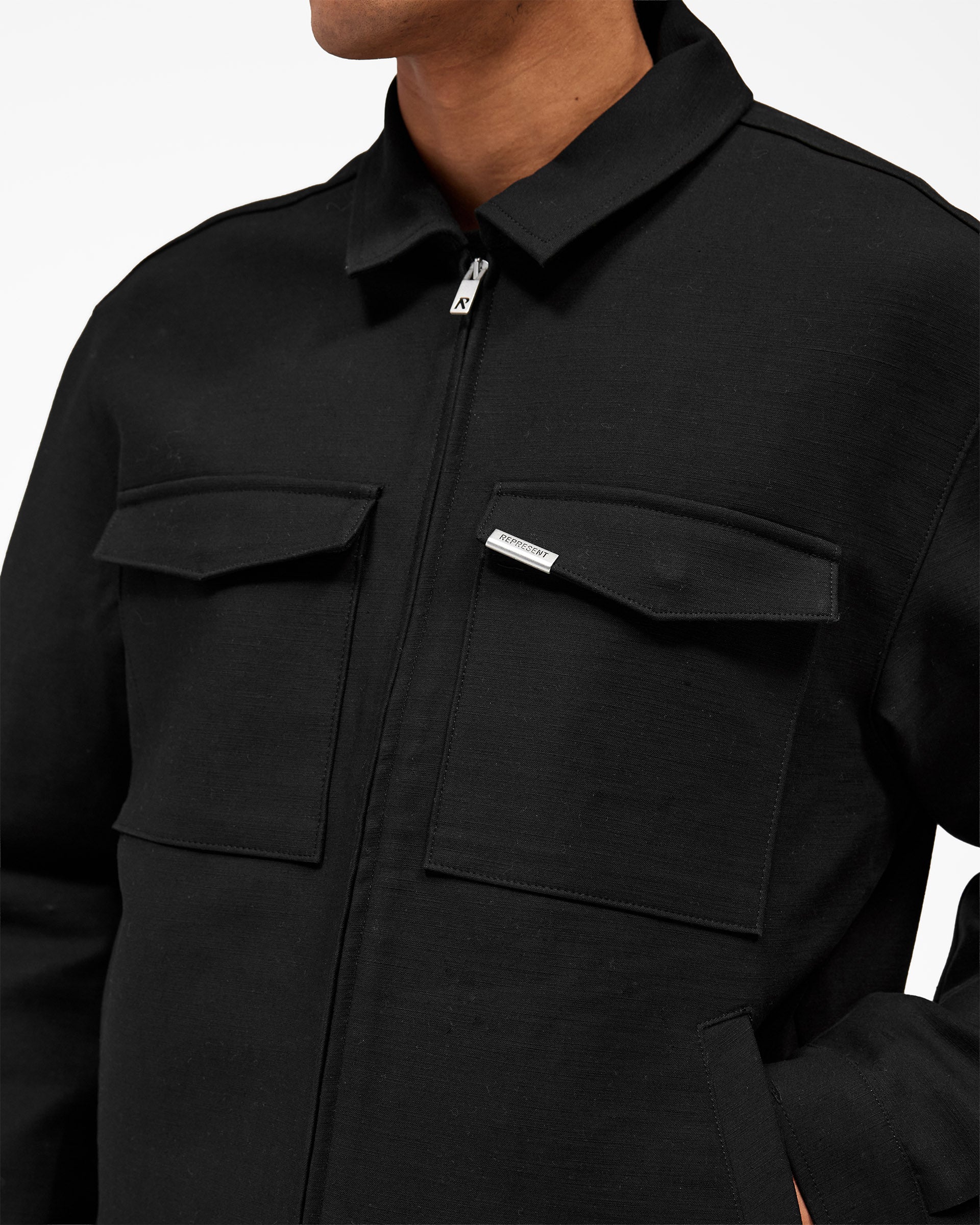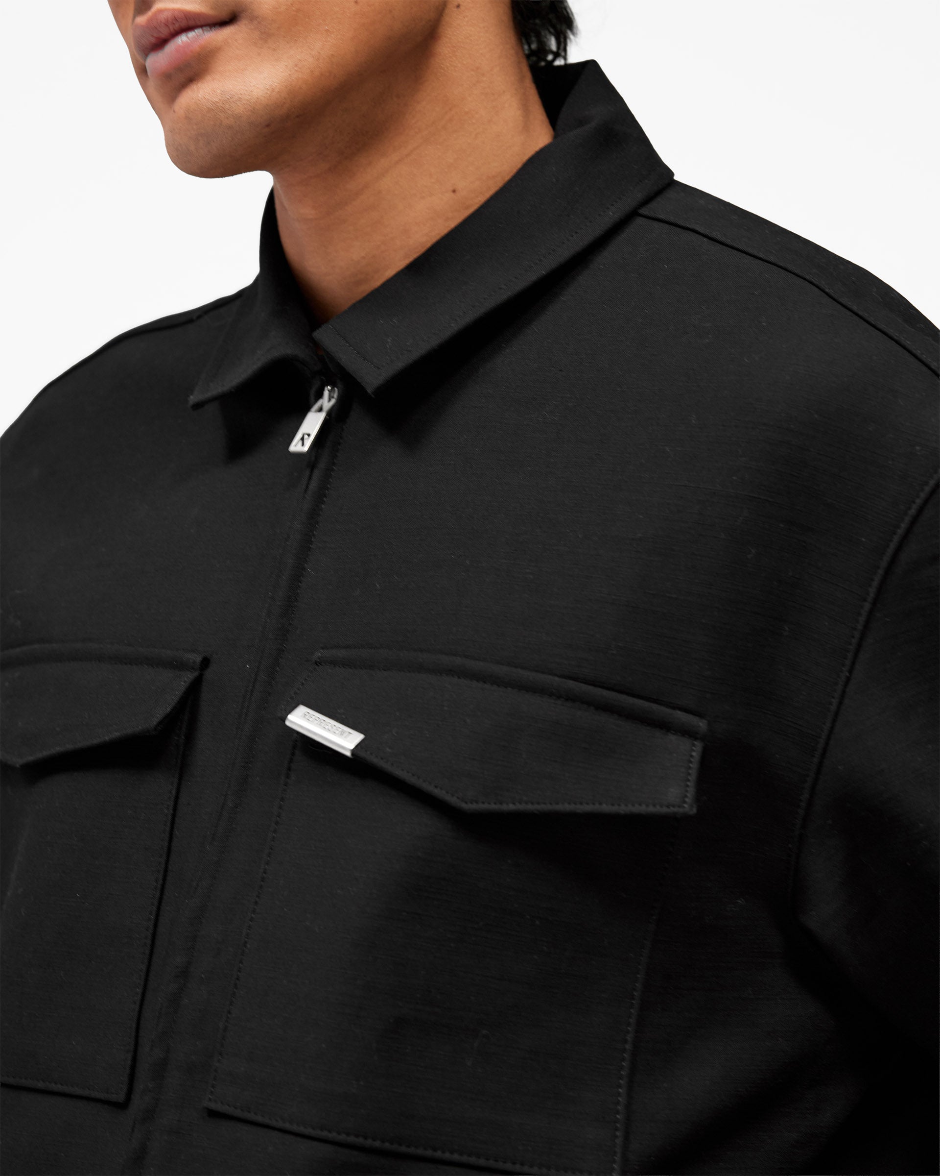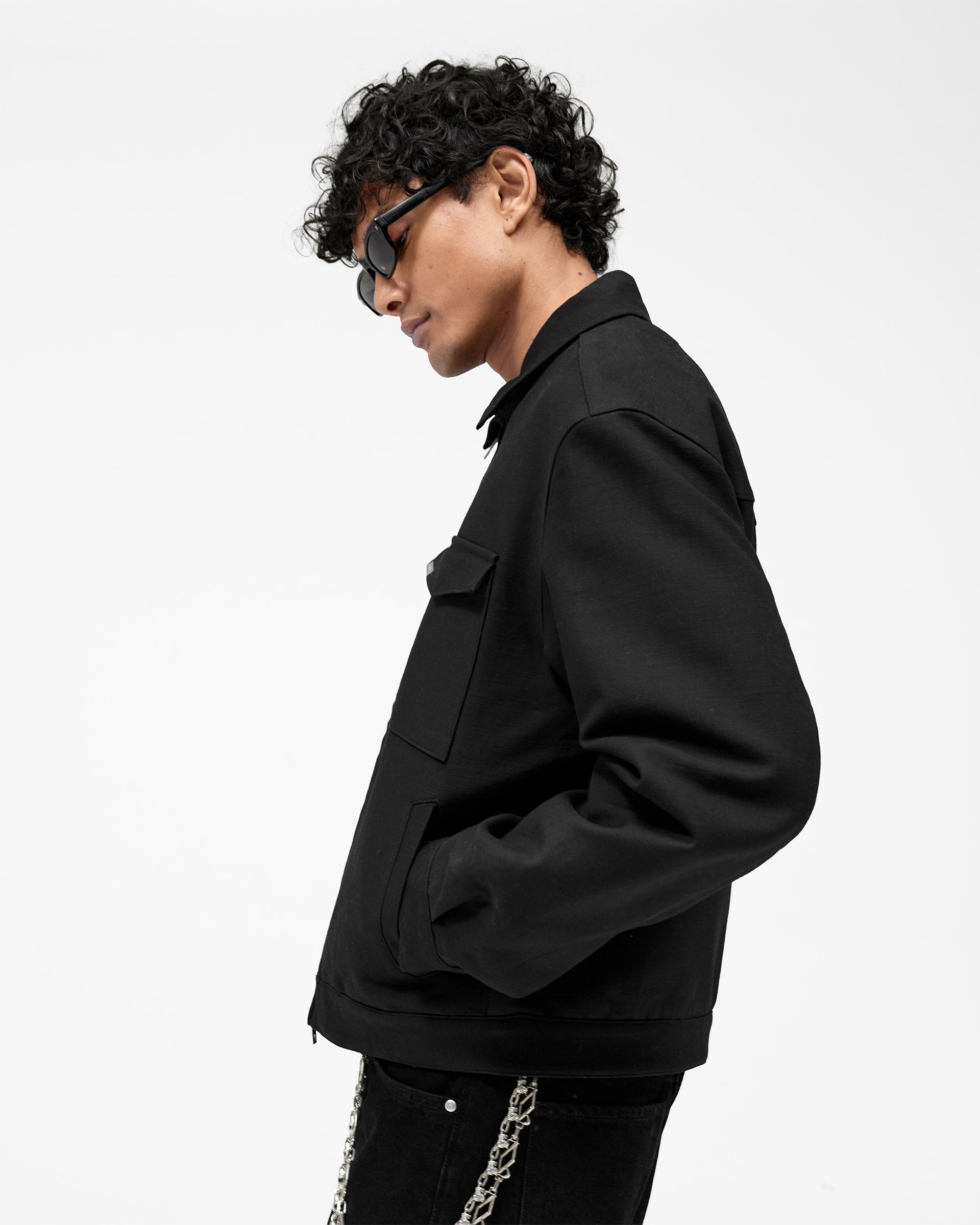 Introducing the Melrose Jacket in Jet Black, a cropped zip-through jacket crafted from heavyweight cotton jersey with a clean, structured construction. The boxy silhouette is built around a pointed collar, dual chest flap pockets and side entry pockets for a utilitarian, workwear-inspired shape.