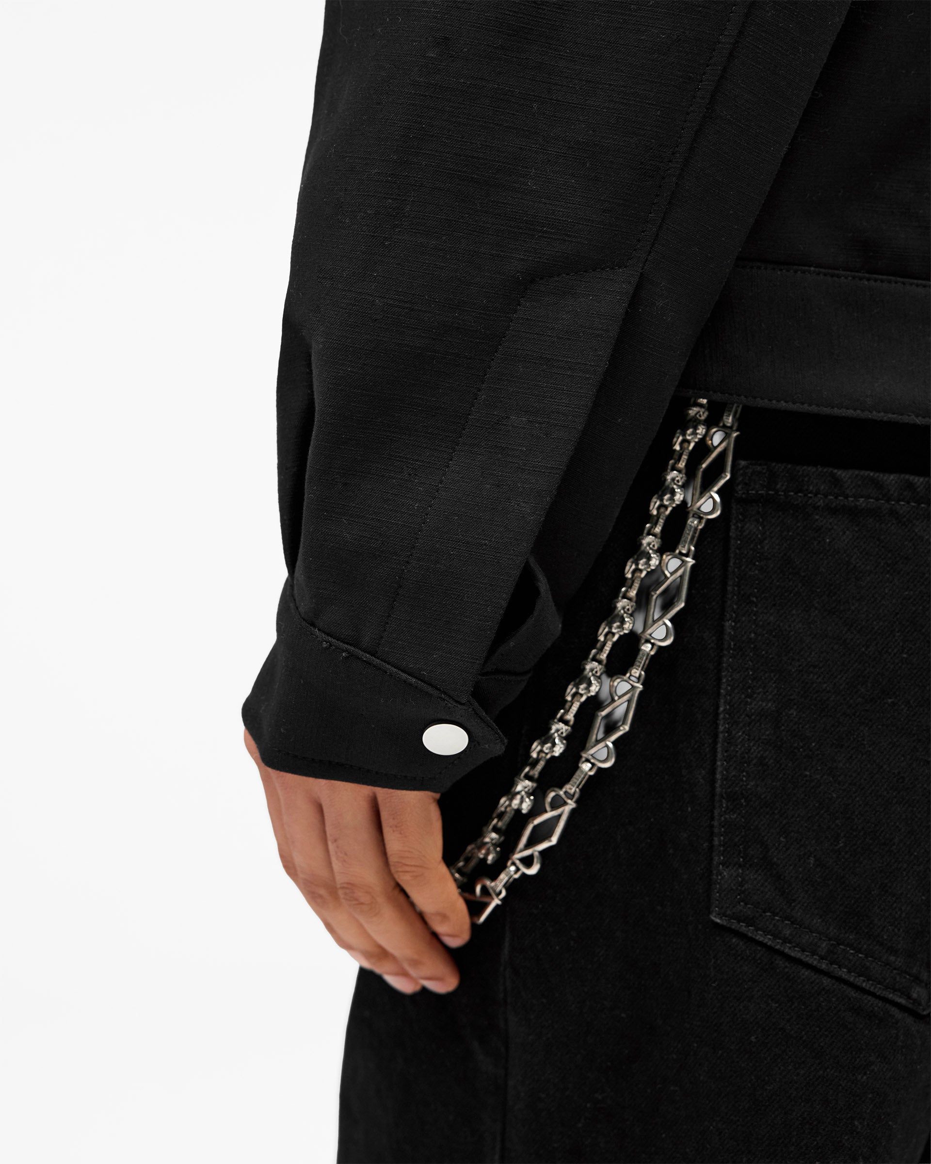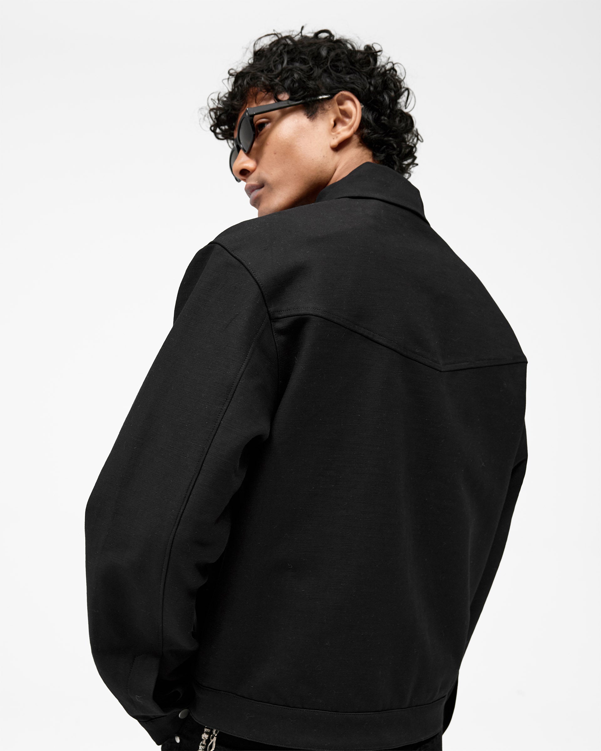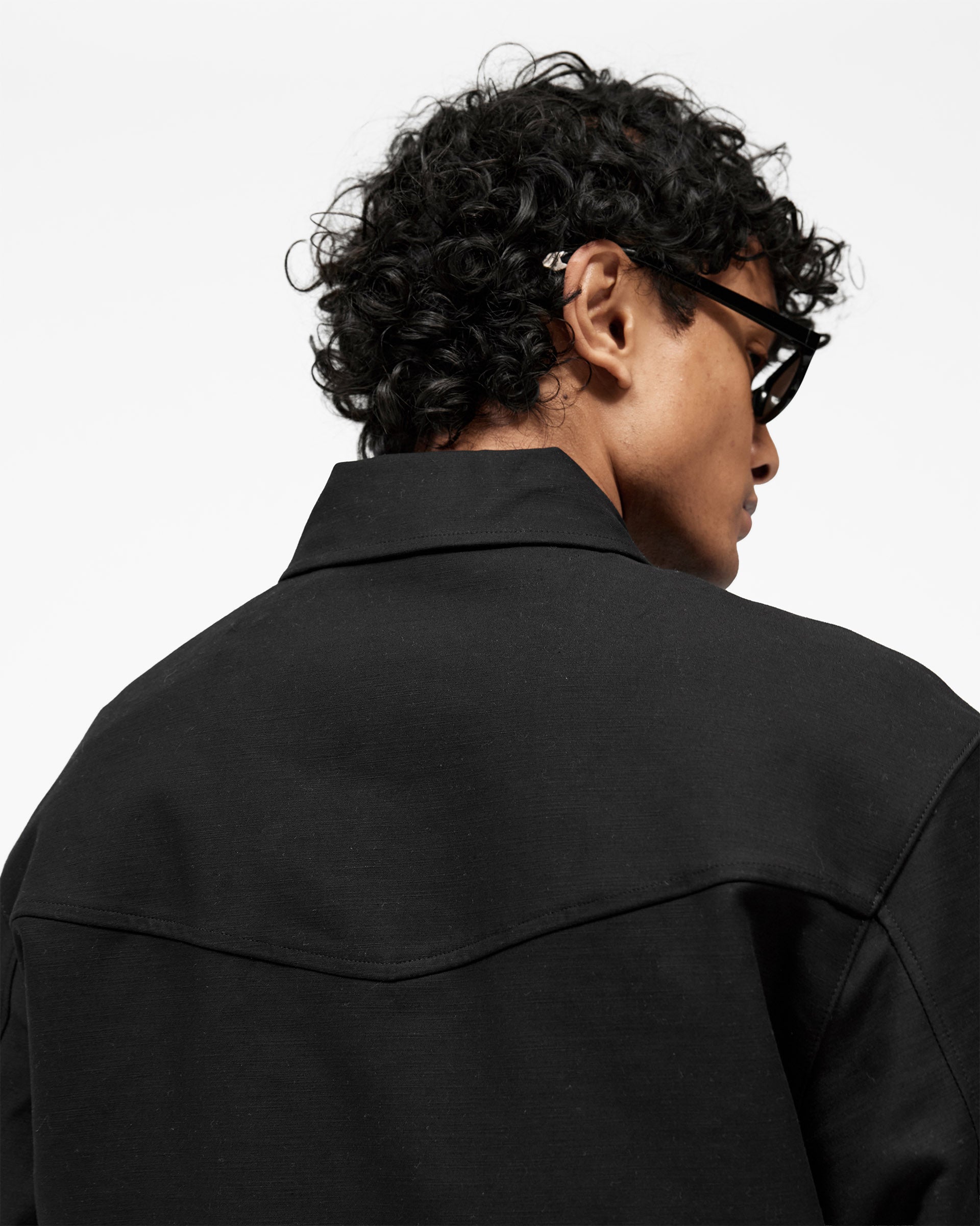 Introducing the Melrose Jacket in Jet Black, a cropped zip-through jacket crafted from heavyweight cotton jersey with a clean, structured construction. The boxy silhouette is built around a pointed collar, dual chest flap pockets and side entry pockets for a utilitarian, workwear-inspired shape.