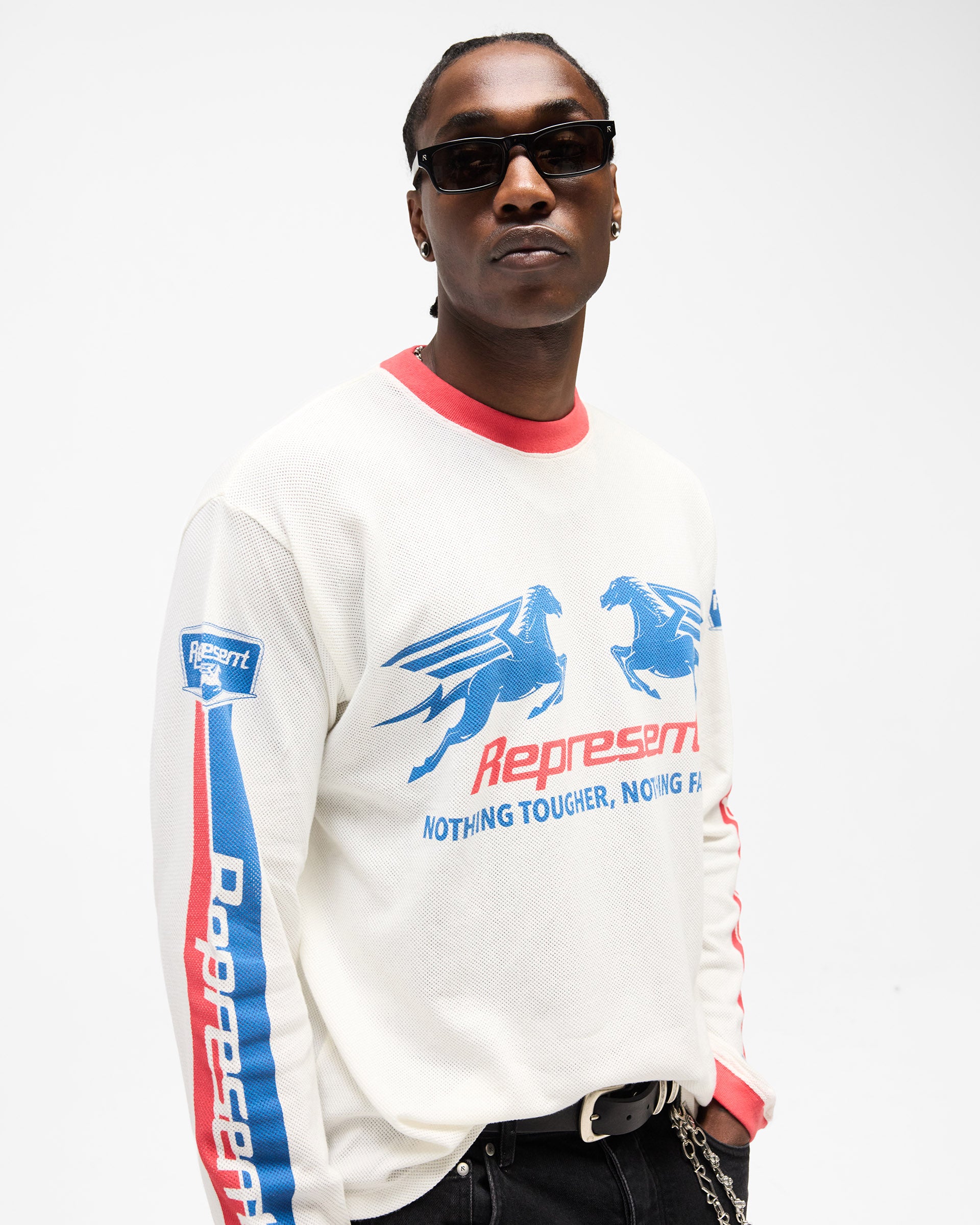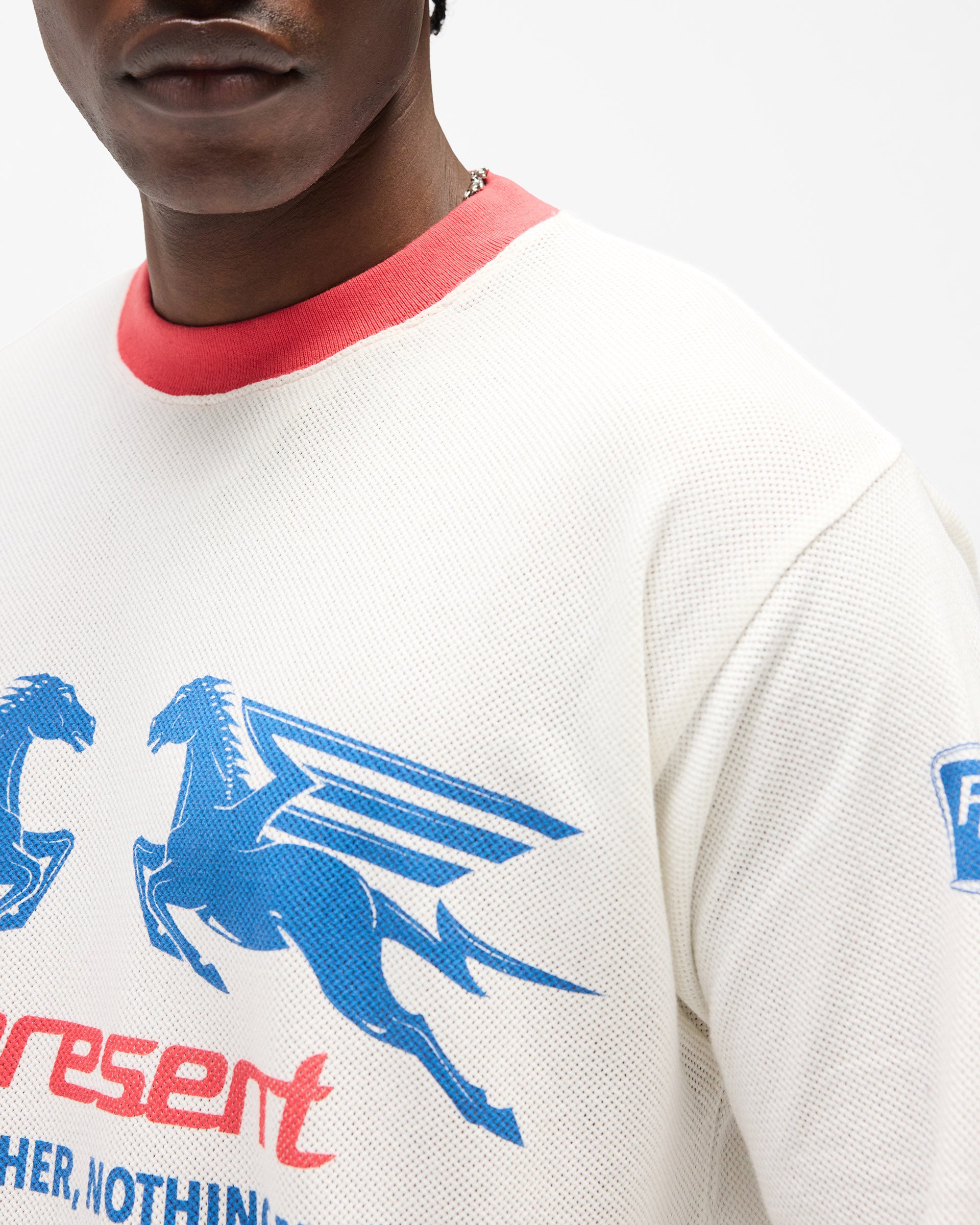 Introducing the Mesh Pegasus Long Sleeve T-Shirt in Flat White, where lightweight construction meets contemporary sportswear sensibility. This regular fit long sleeve piece features a 100% cotton mesh body that breathes whilst maintaining its shape. The Pegasus silhouette speaks to movement and ease, designed for everyday wear with understated refinement.