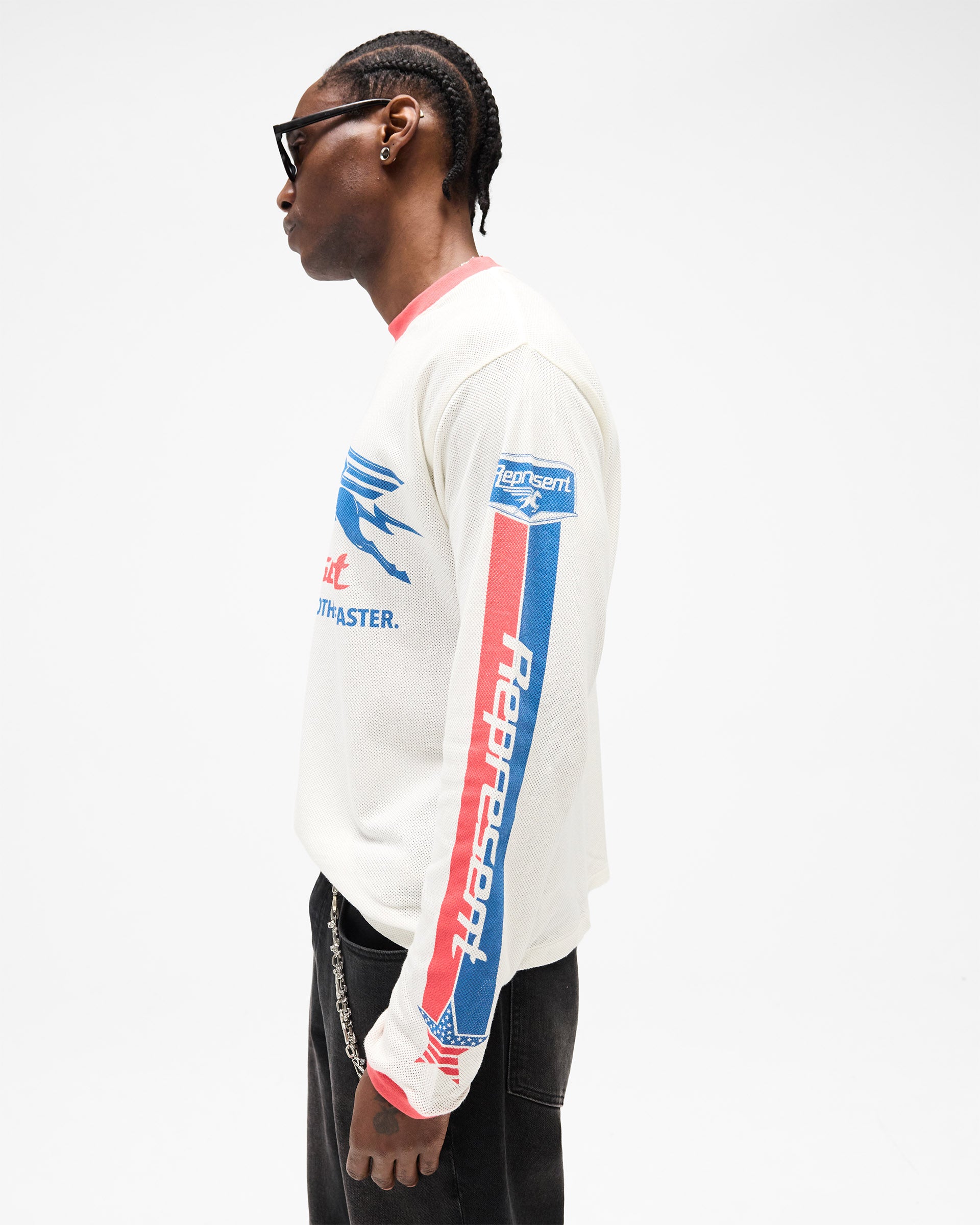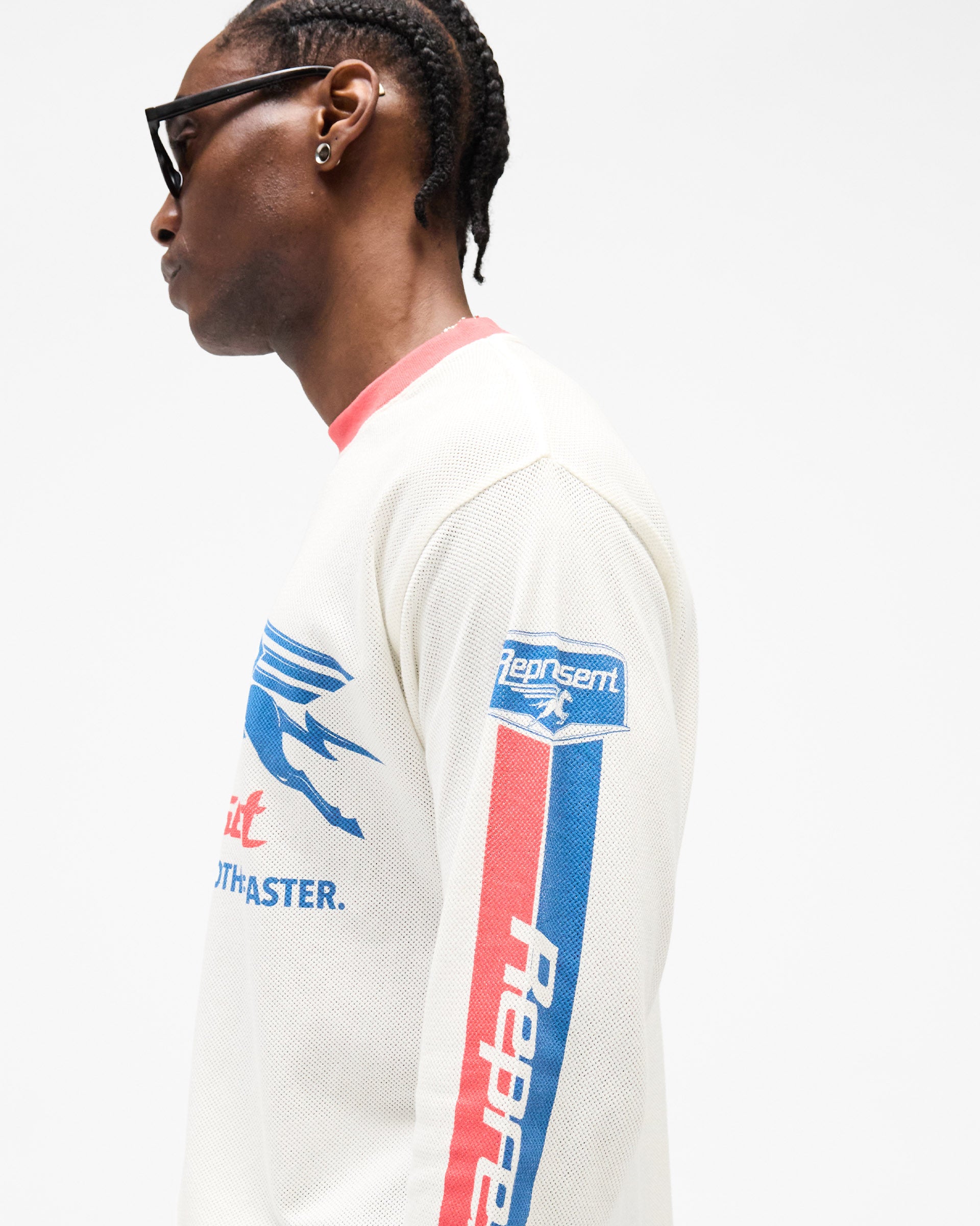 The construction embraces mixed textiles. The body is crafted from airy cotton mesh at 135GSM, allowing circulation without sacrificing structure. The rib collar combines 96% cotton with 4% elastane for gentle stretch and durability. A signature metal bar sits at the hem, and the front graphic is applied with precision. The regular fit long sleeve shape is designed to sit comfortably through layering or worn alone, with signature detailing that grounds the silhouette.