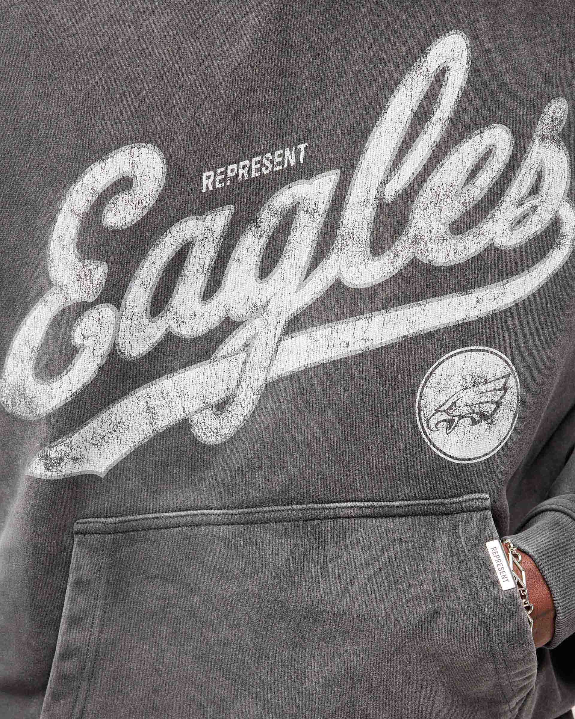 Represent x NFLFirst collaboration between Represent and the National Football League, in partnership with Fanatics.Heavyweight Loopback Fleece485gsm cotton with silicone wash for a naturally faded, vintage finish.Eagles Screen PrintWater-based graphics with script branding and circular logo patch.Twin Stitch ConstructionDouble-layer hood with Cobrax popper and Represent metal bar finishing.