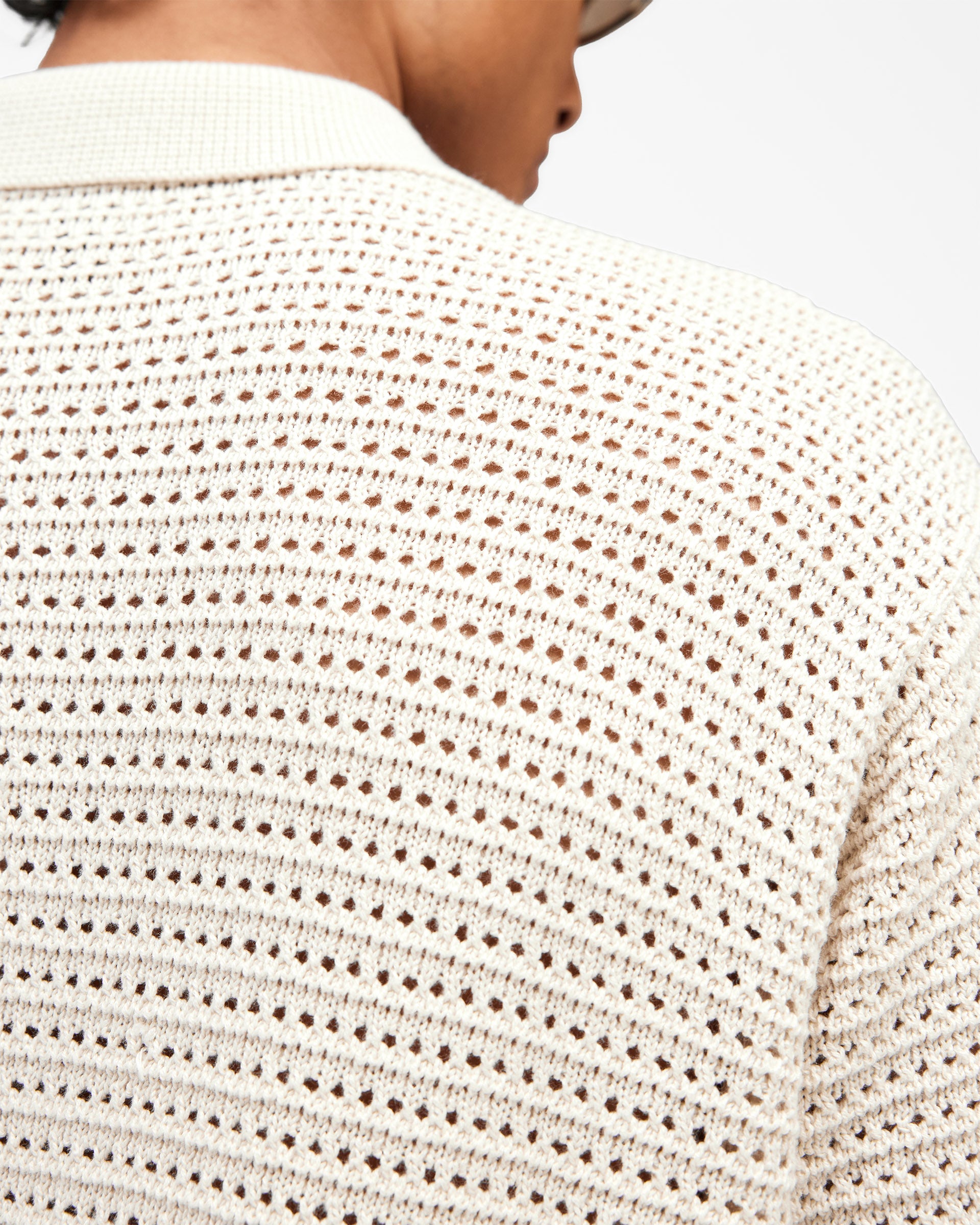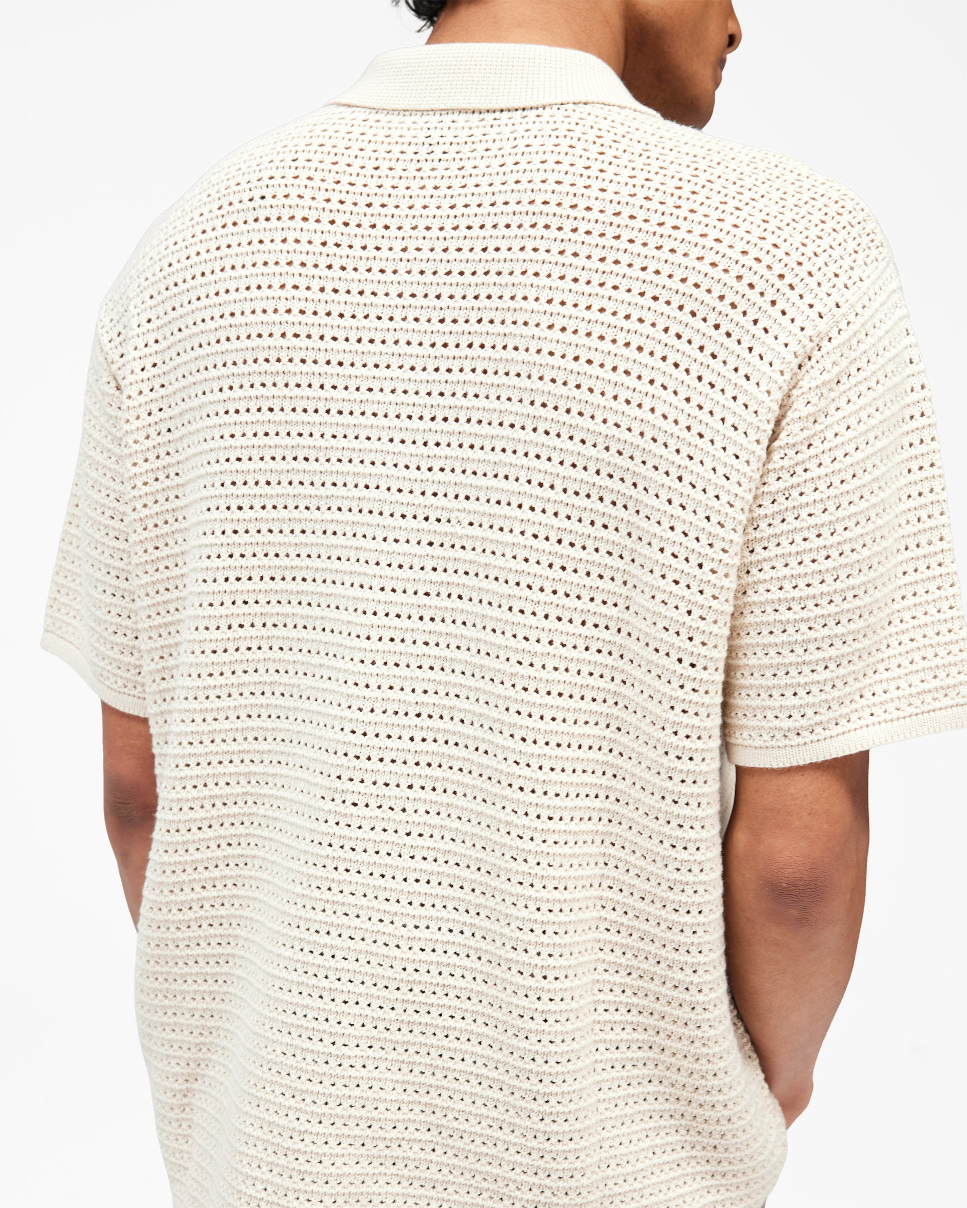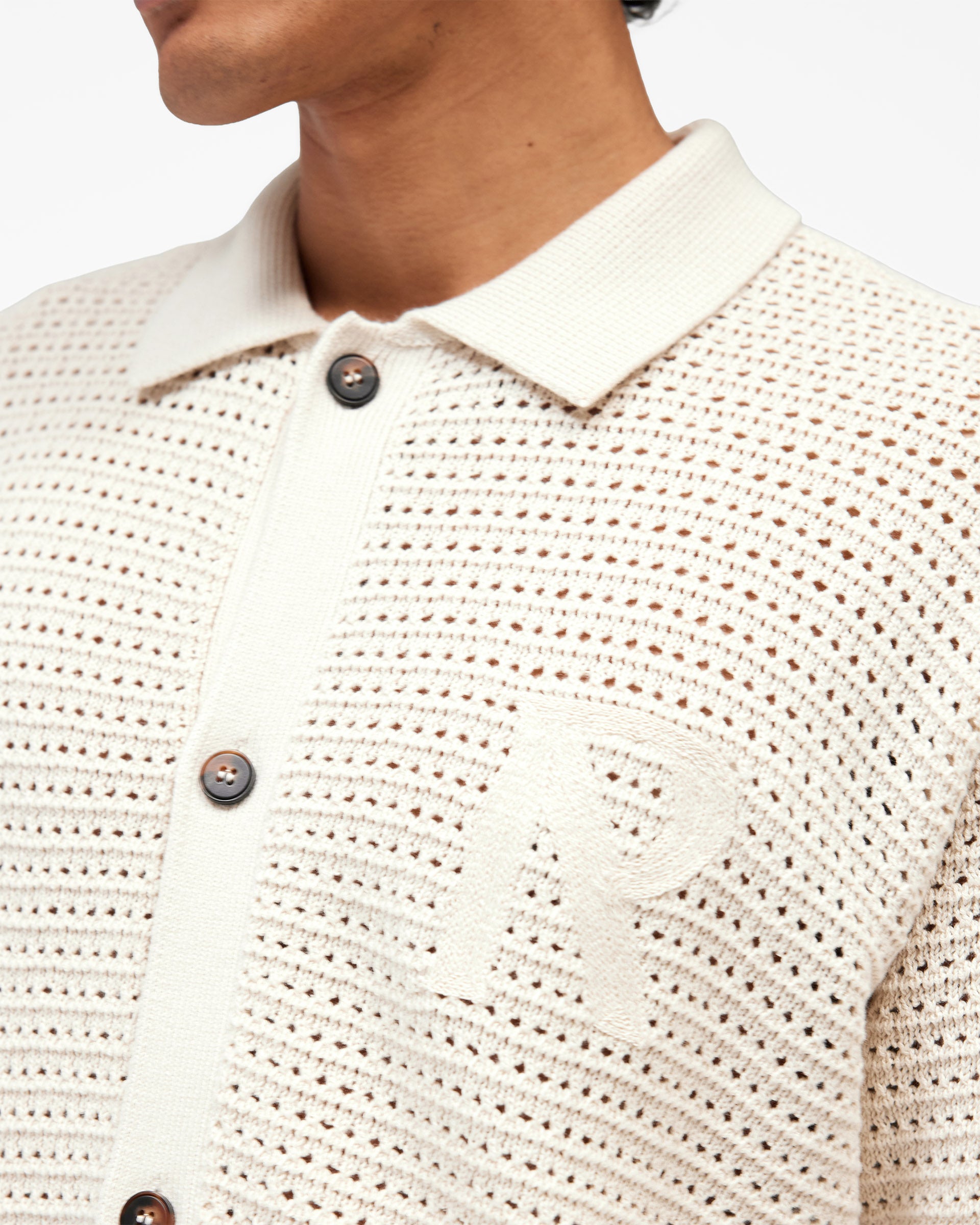 Introducing the Pico Knit Shirt in Ecru, a refined short-sleeve shirt built from open knit 7GG cotton. Featuring a Milano knit collar with collar stand, a full needle placket, an embroidered initial at the chest, and tubular finish to hem and cuffs, this piece demonstrates construction care throughout. Fully linked seams ensure durability, while the open knit fabric creates a breathable, refined aesthetic suitable for layering or standalone wear.