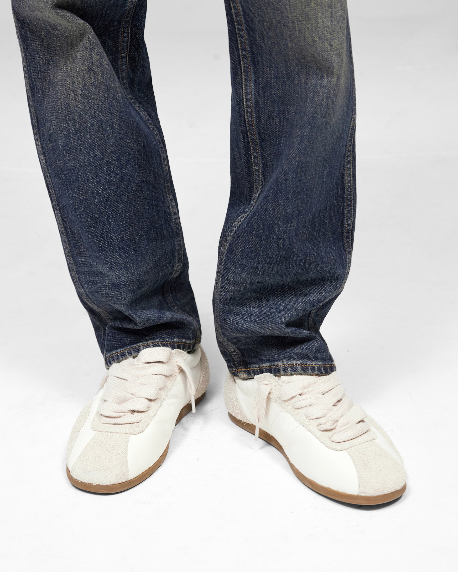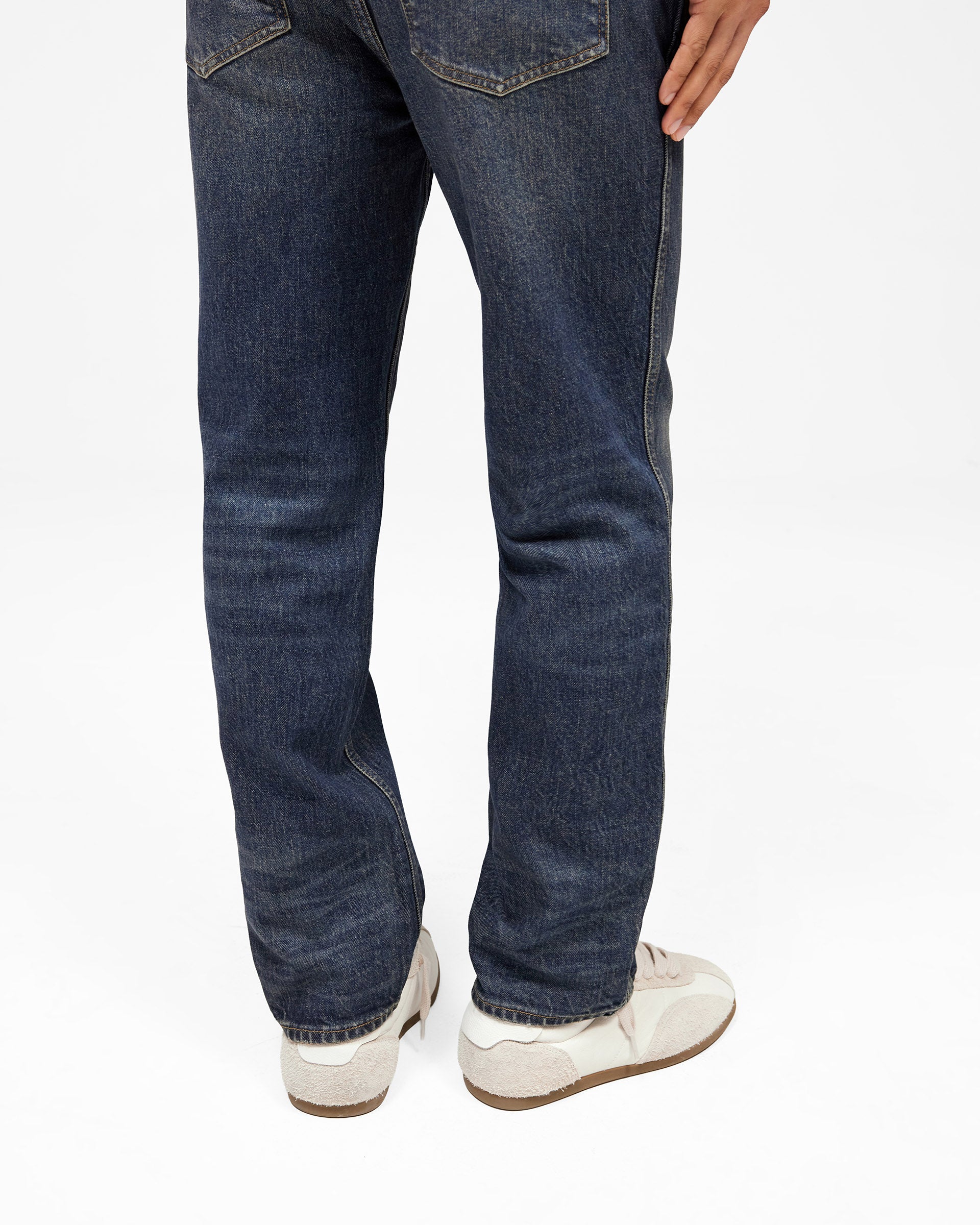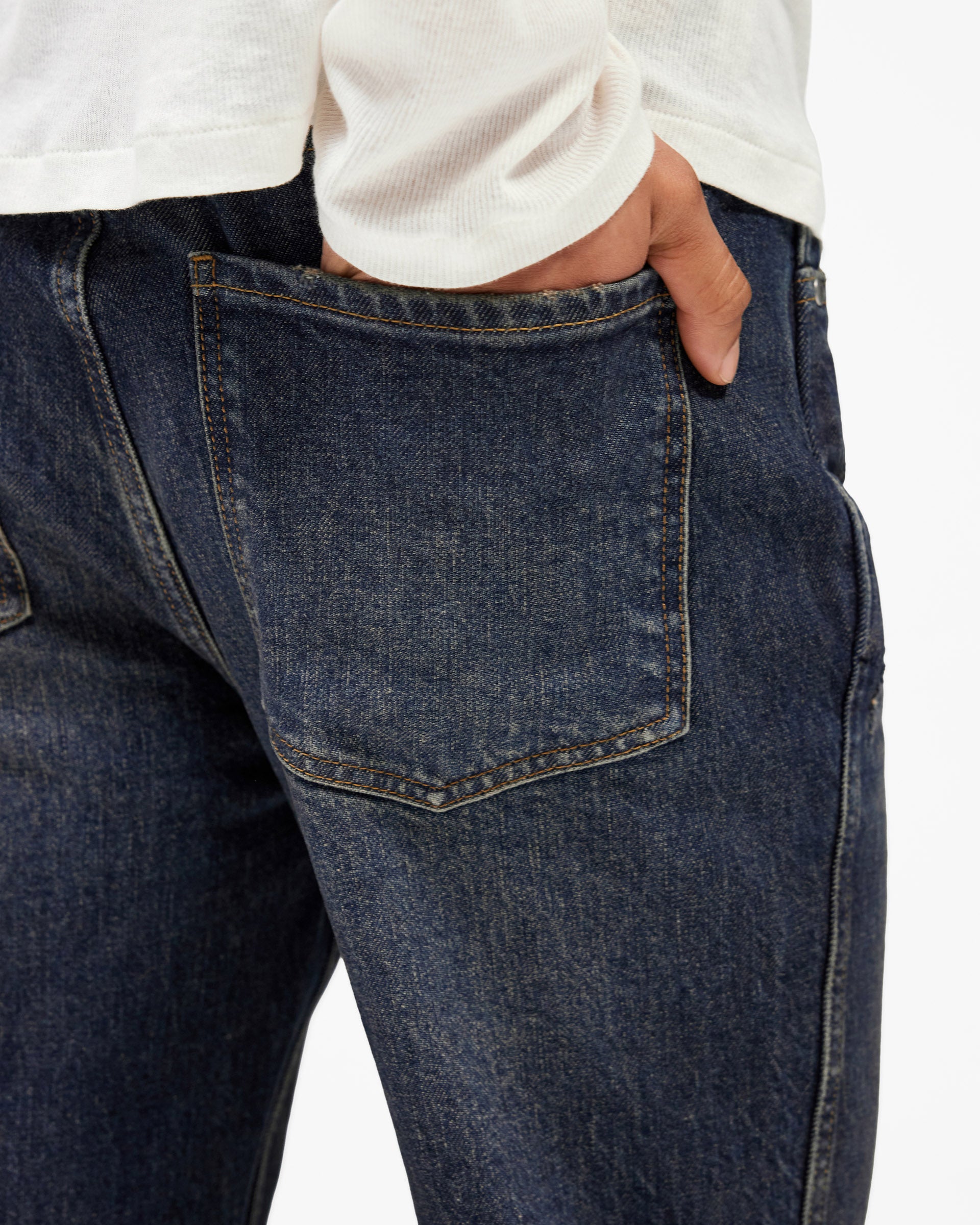 Introducing the R1 Slim Denim in Blue Marble, a tapered silhouette crafted from stretch cotton denim with a mid-washed base and brown tint overdye. Natural wear distressing and whiskering create authentic vintage character, whilst the stretch construction provides contemporary comfort.
