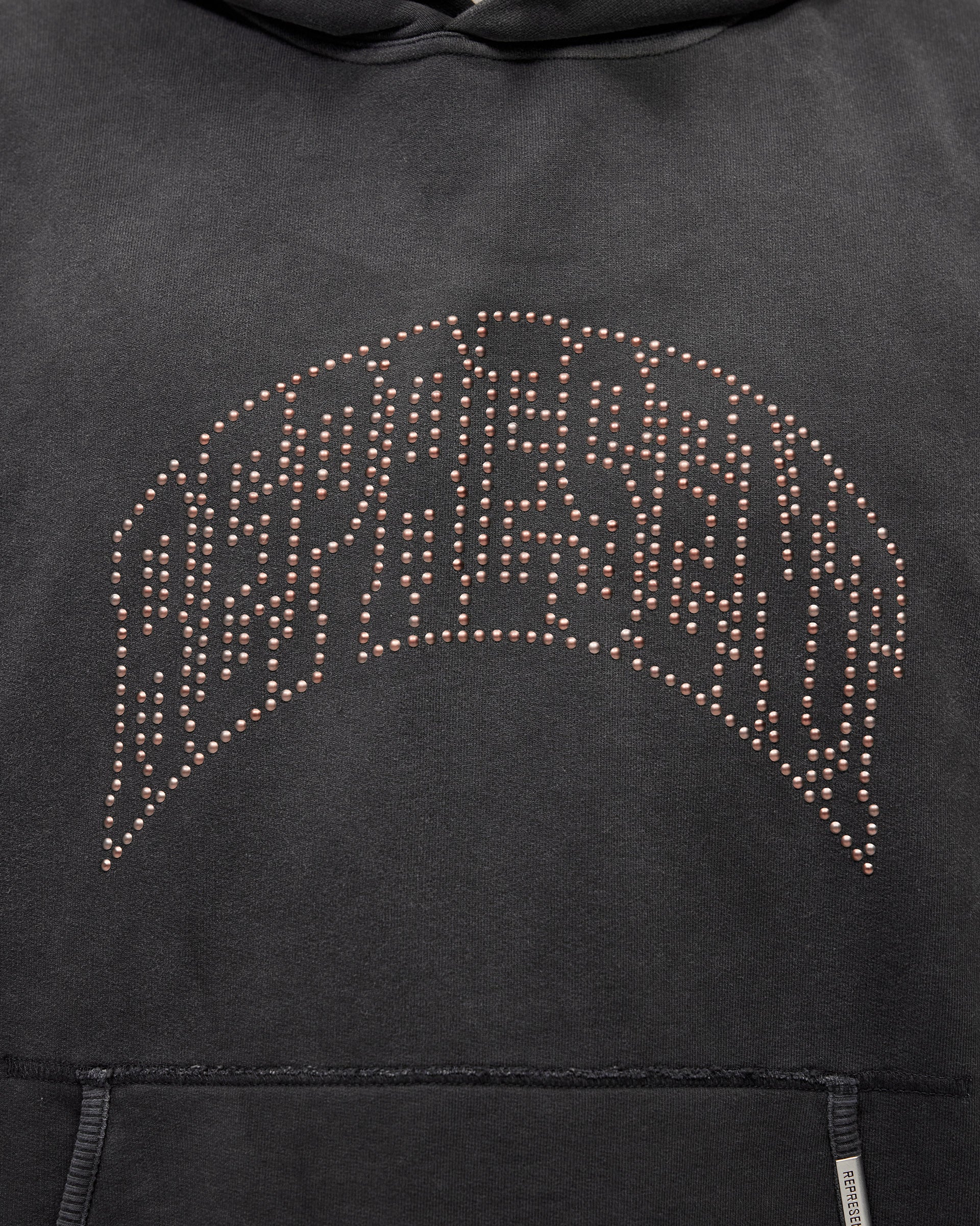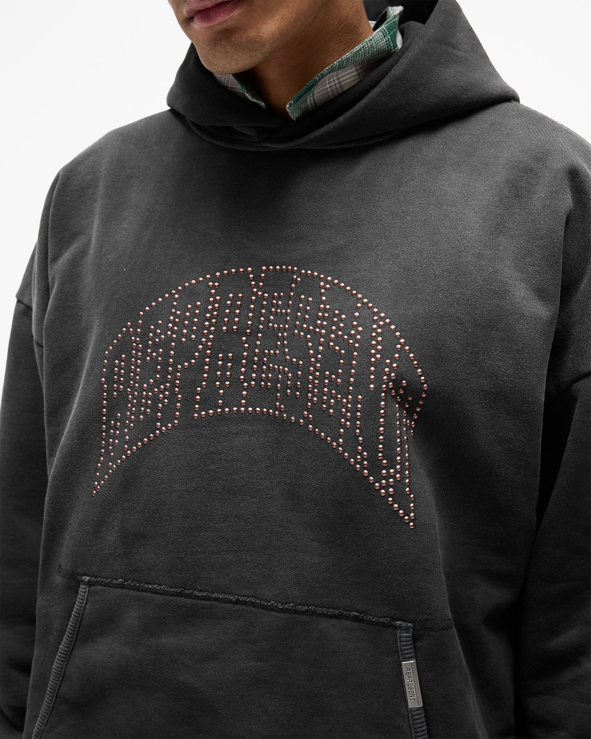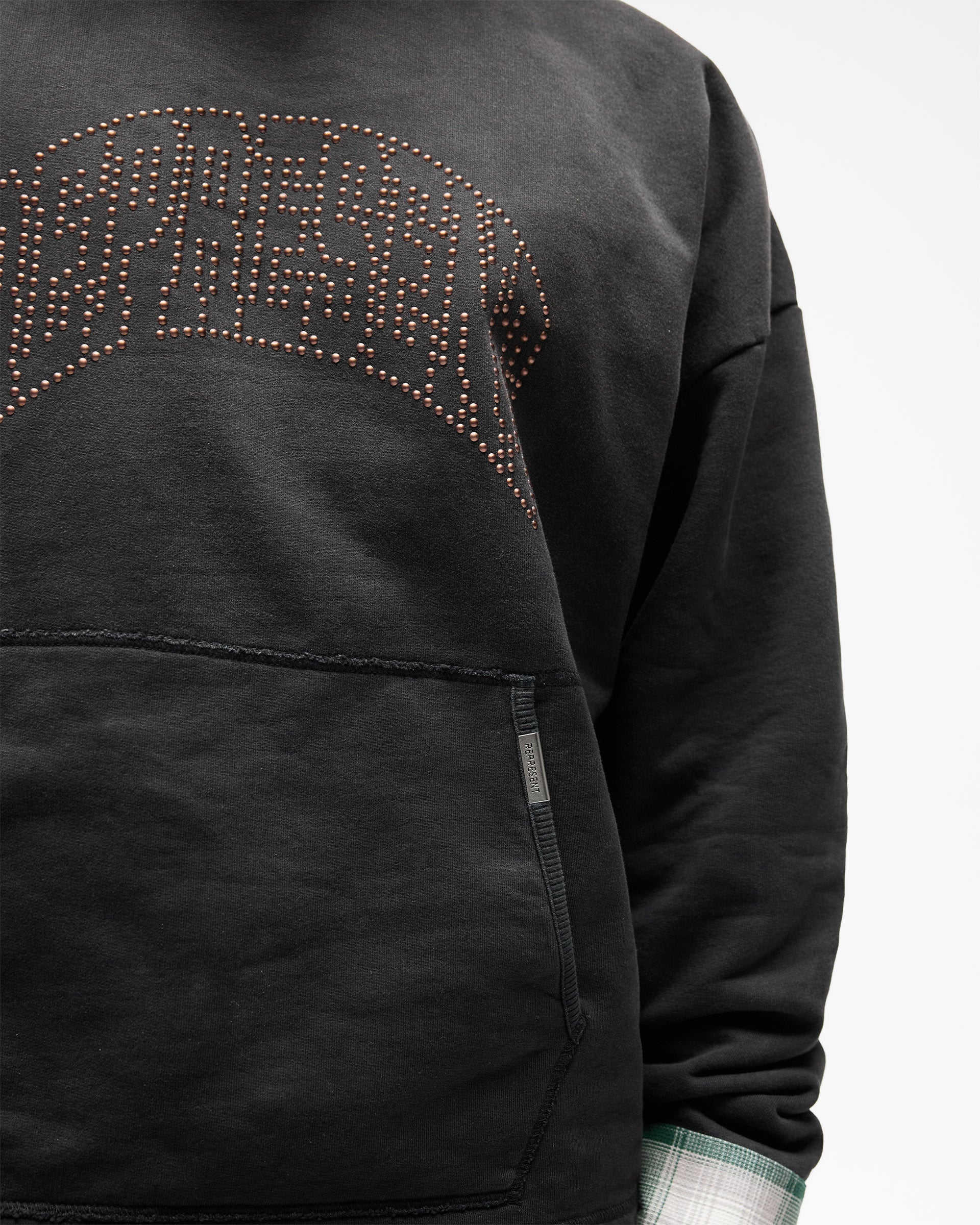 Introducing the Represent Embellished Hoodie in Stained Black, an oversized hoodie crafted from heavyweight cotton jersey with a lived-in stained finish. The front features the arched Represent logo rendered in individual metal claw studs, catching the light for a textured, tonal effect against the dark base.