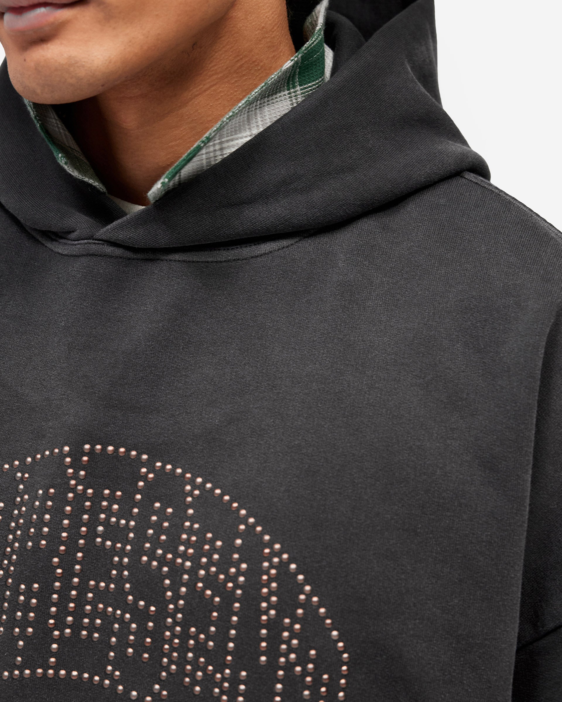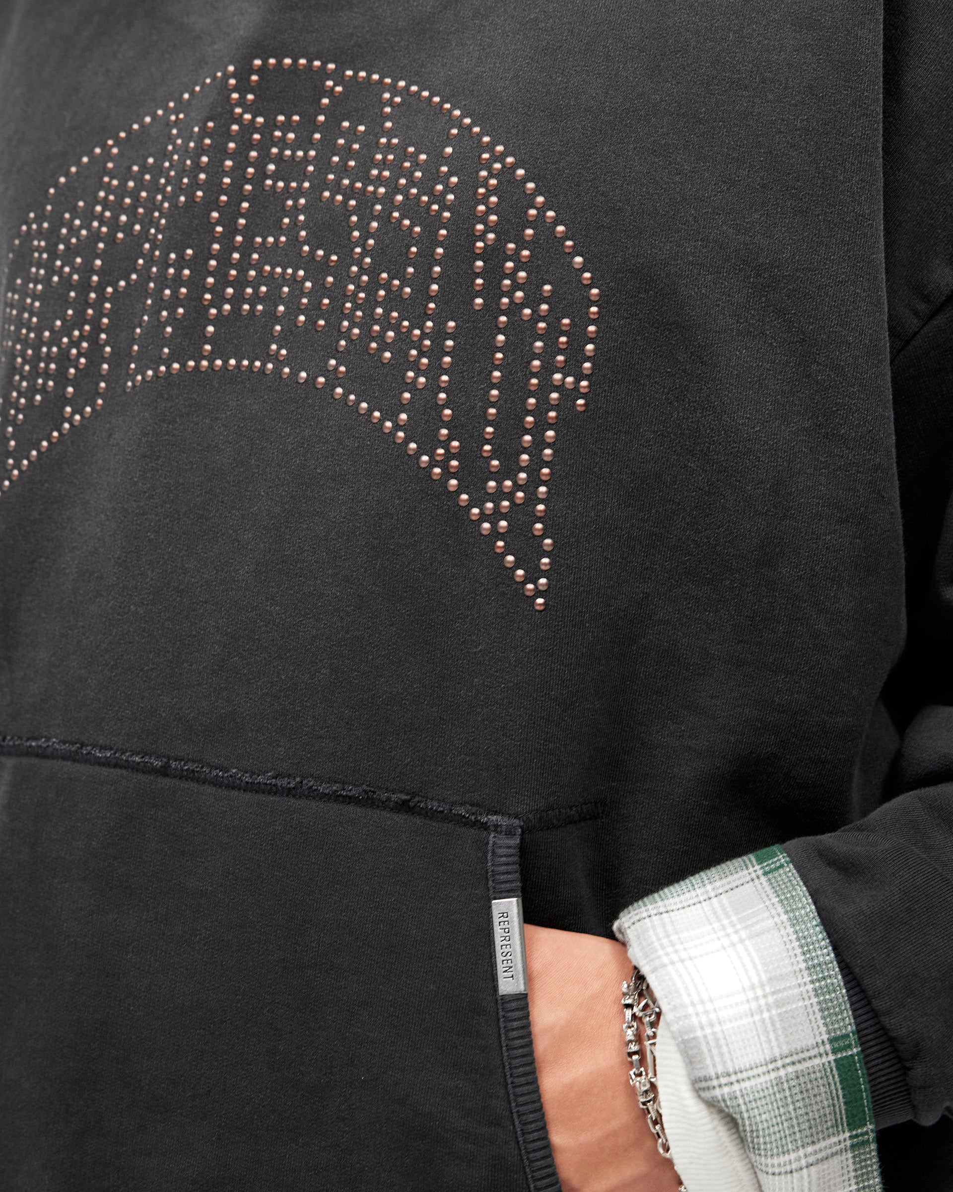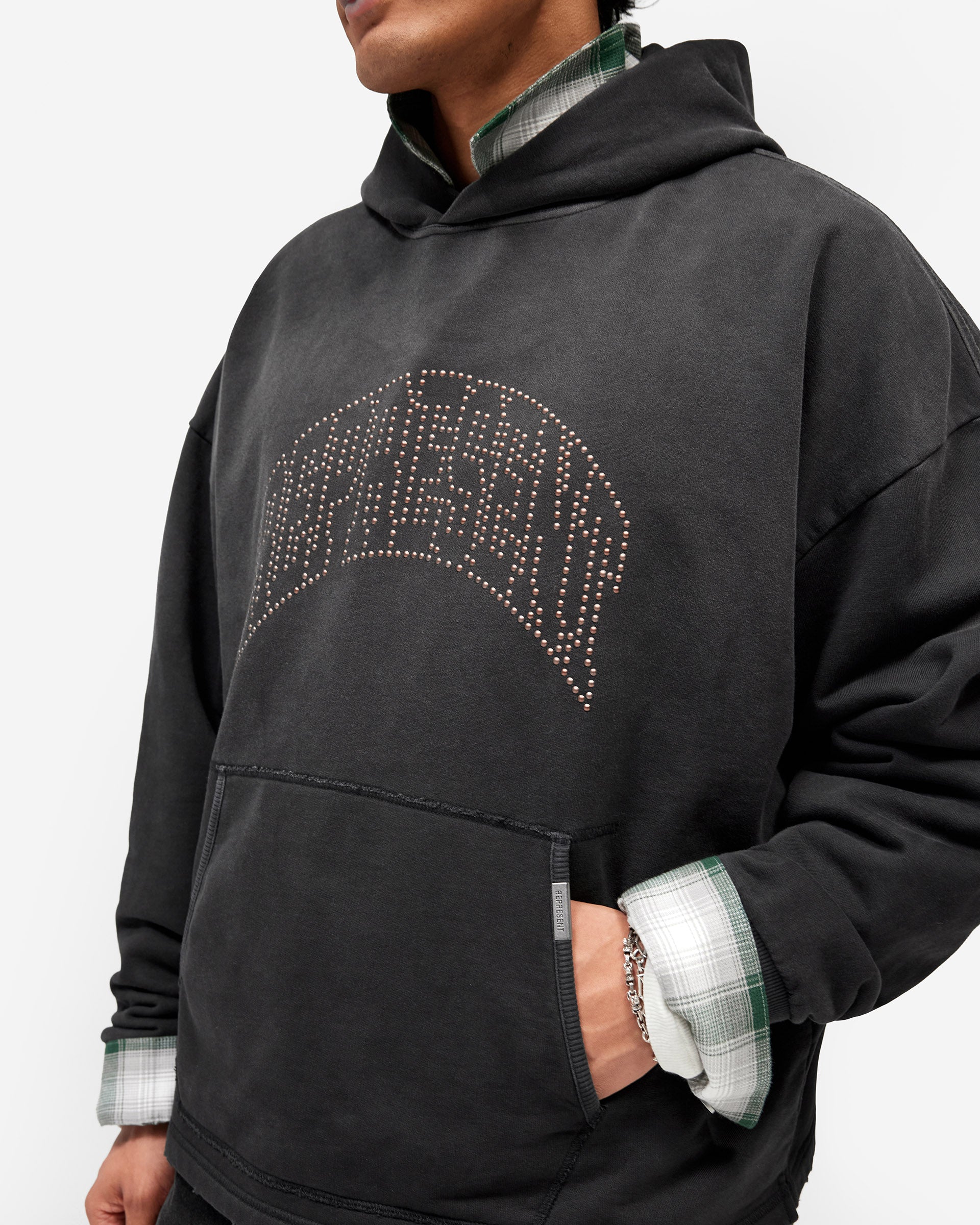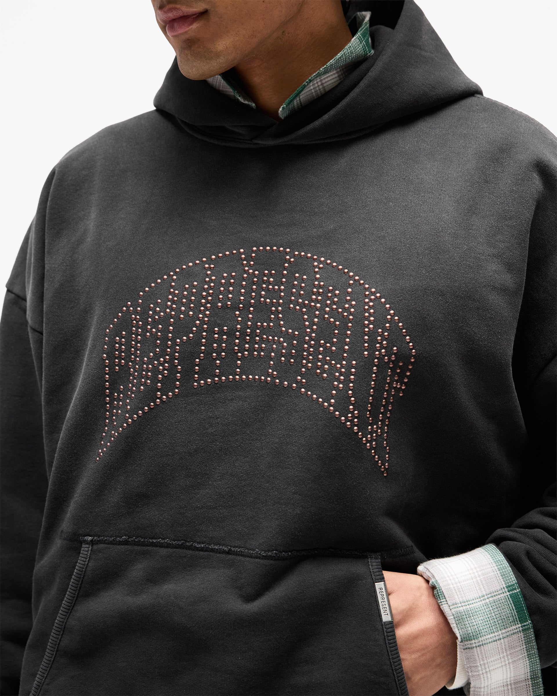 Introducing the Represent Embellished Hoodie in Stained Black, an oversized hoodie crafted from heavyweight cotton jersey with a lived-in stained finish. The front features the arched Represent logo rendered in individual metal claw studs, catching the light for a textured, tonal effect against the dark base.