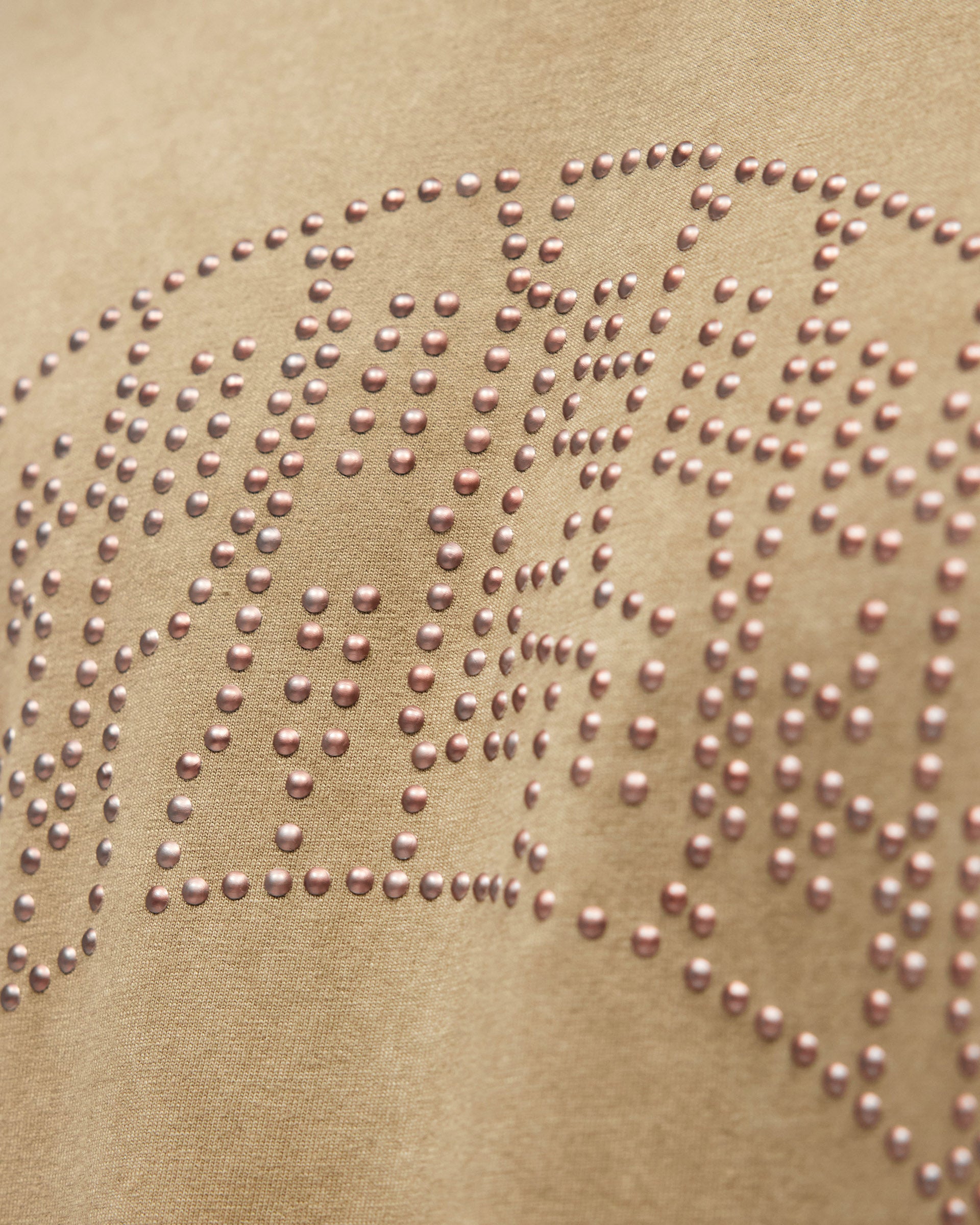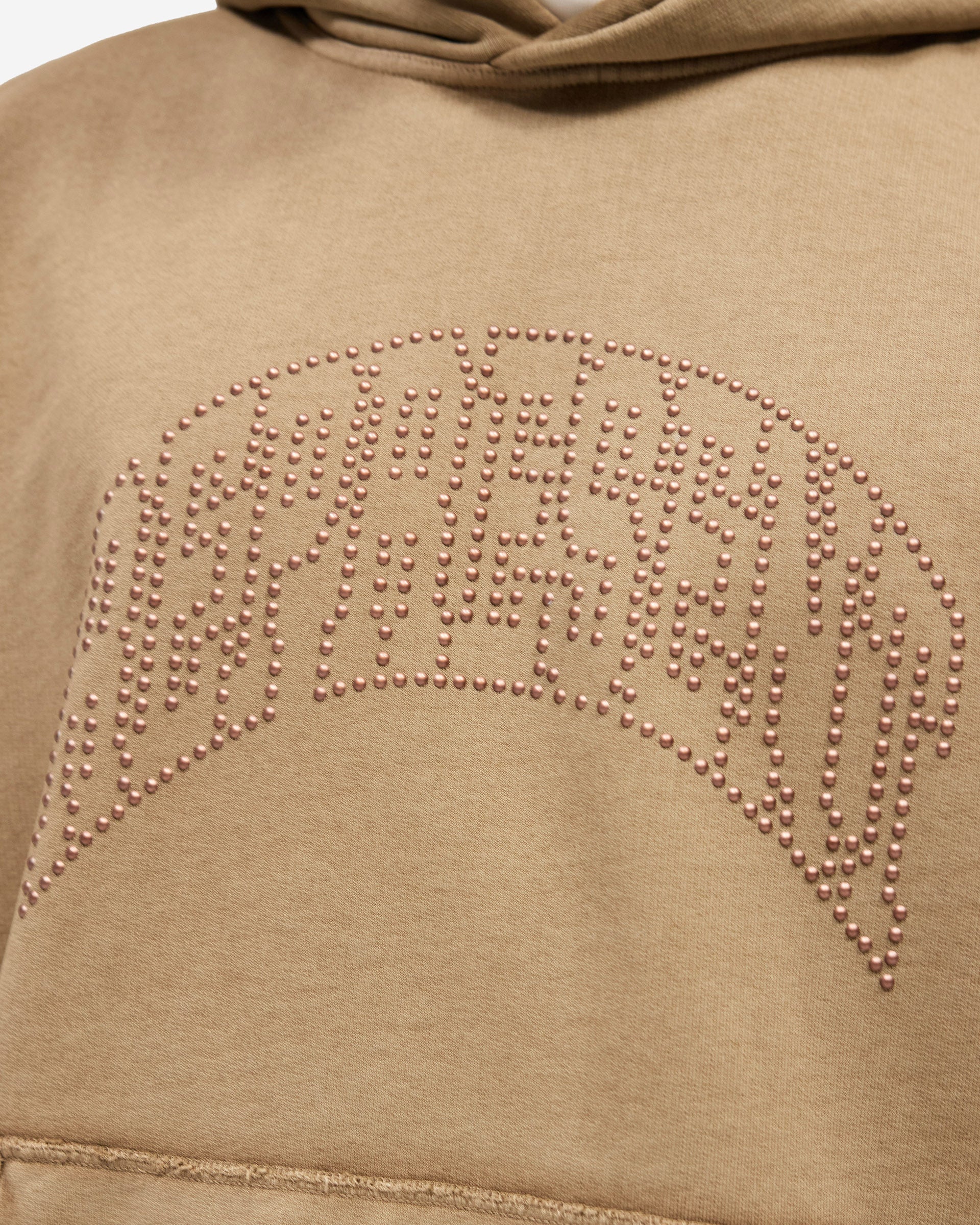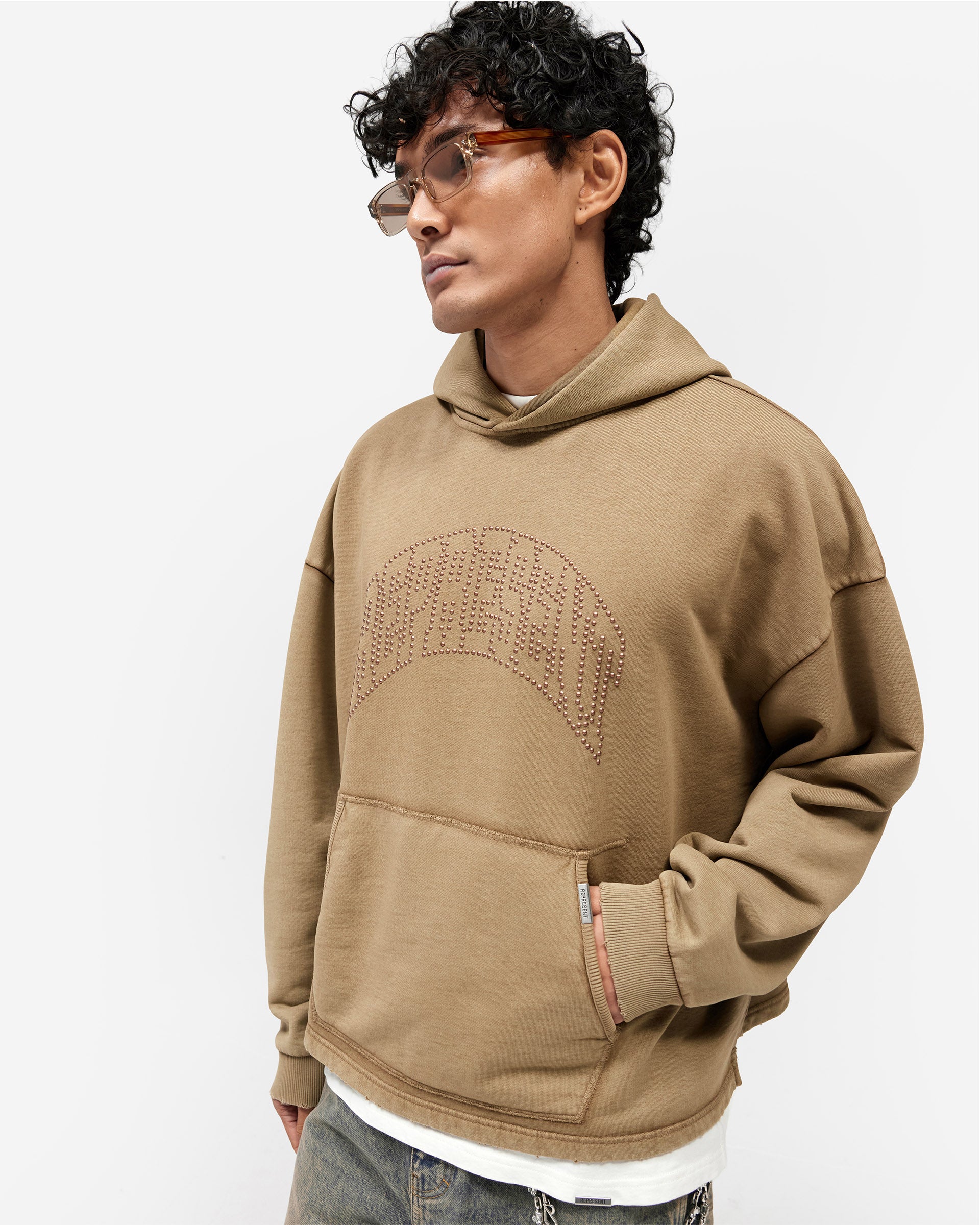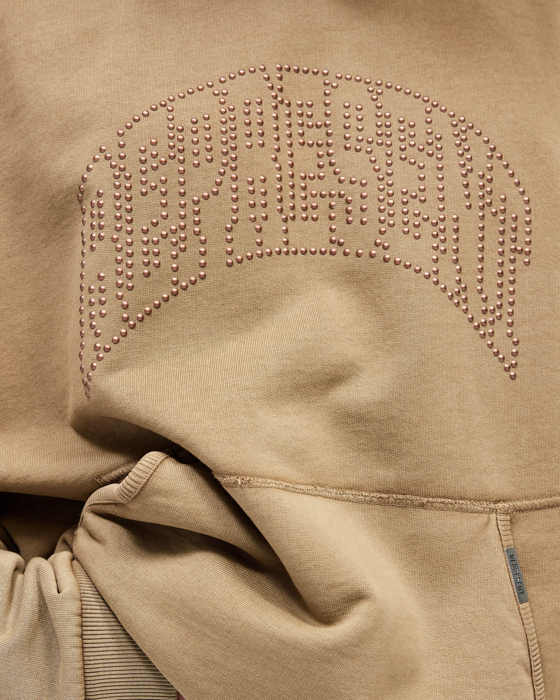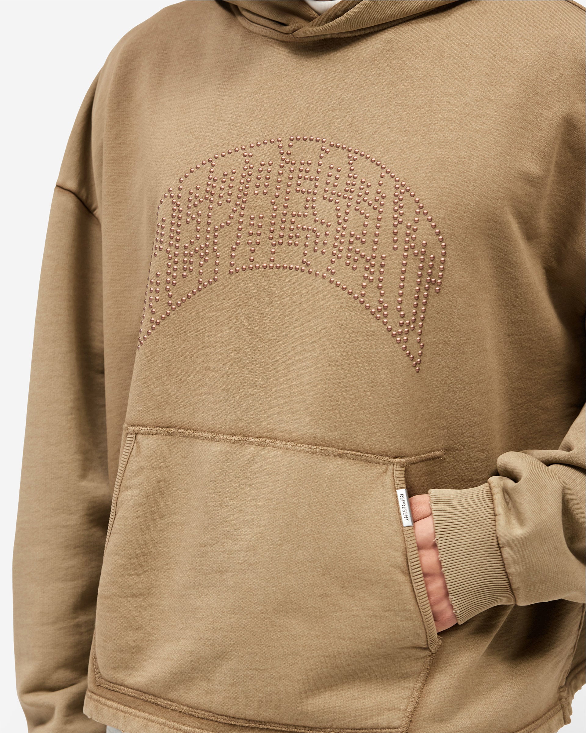 Introducing the Represent Embellished Hoodie in Vintage Khaki, an oversized hoodie crafted from heavyweight cotton jersey with a washed vintage finish. The front features the arched Represent logo rendered in individual metal claw studs, sitting tonal against the khaki base for a subtle, textured effect.