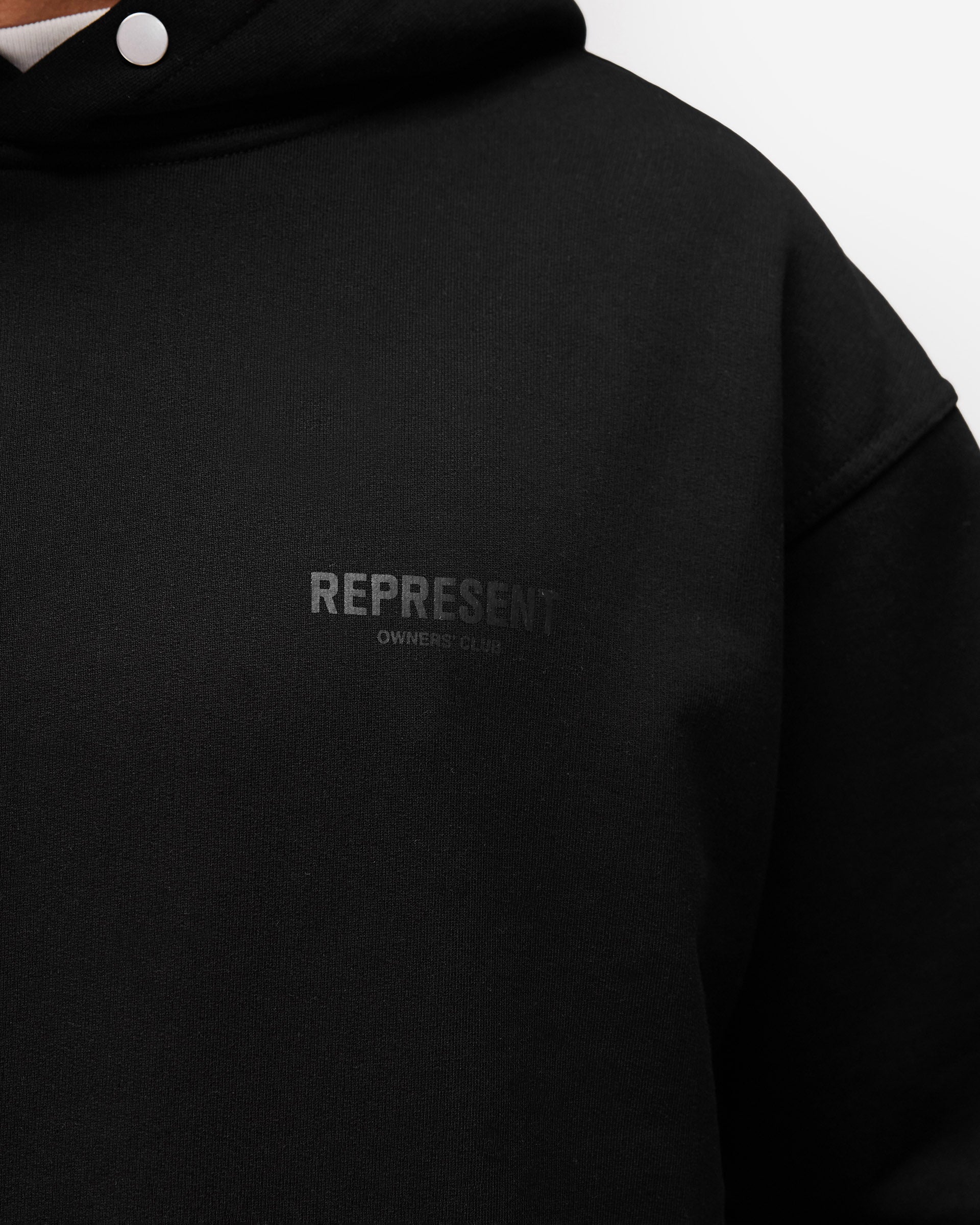 Introducing the Represent Owners Club Hoodie in Matte Black. Our most recognised piece, born in Manchester and worn worldwide. Cut from 480gsm heavyweight loopback cotton, piece dyed and mineral washed for a tonal matte finish. Pre-shrunk for a lived-in feel from the first wear, with matte black Owners Club branding to the chest and back, a Cobrax popper hood, ribbed trims and our signature oversized fit that falls wide and square. Made in Portugal.
