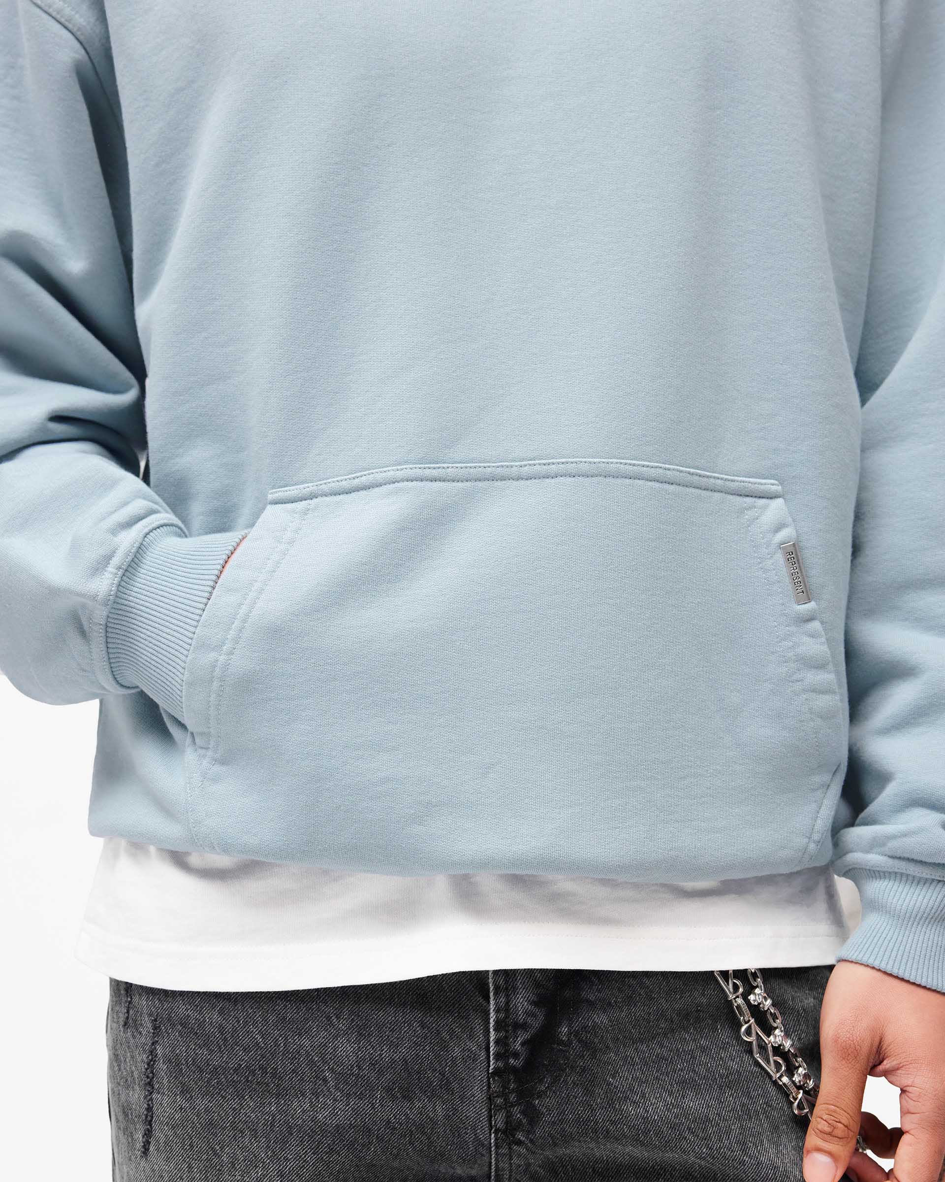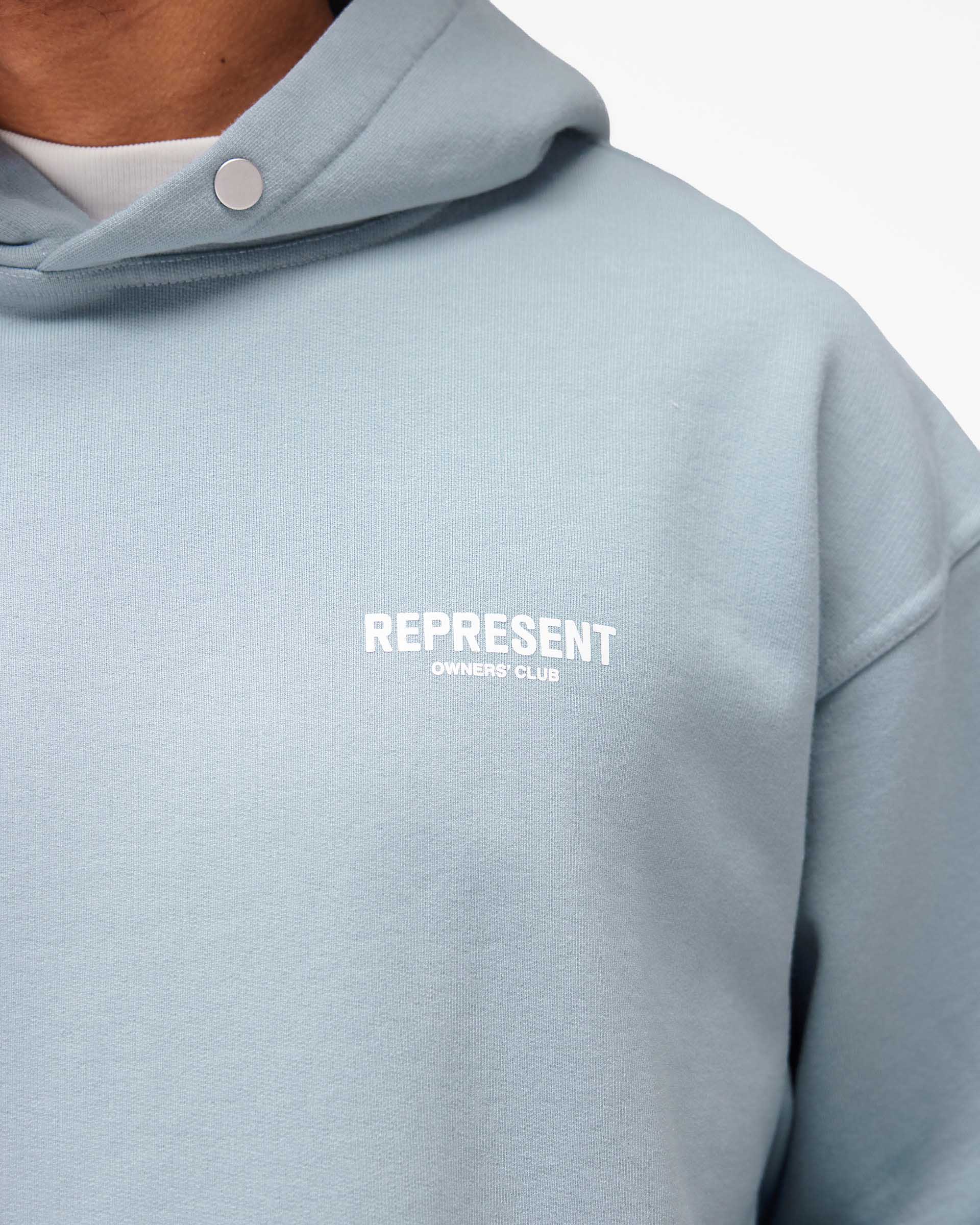 Introducing the Represent Owners Club Hoodie in Powder Blue. Our most recognised piece, born in Manchester and worn worldwide. Cut from 480gsm heavyweight loopback cotton, piece dyed for depth of colour and pre-shrunk for a lived-in feel from the first wear. Owners Club branding sits to the chest and back, finished with a Cobrax popper hood, ribbed trims and our signature oversized fit that falls wide and square. Made in Portugal.