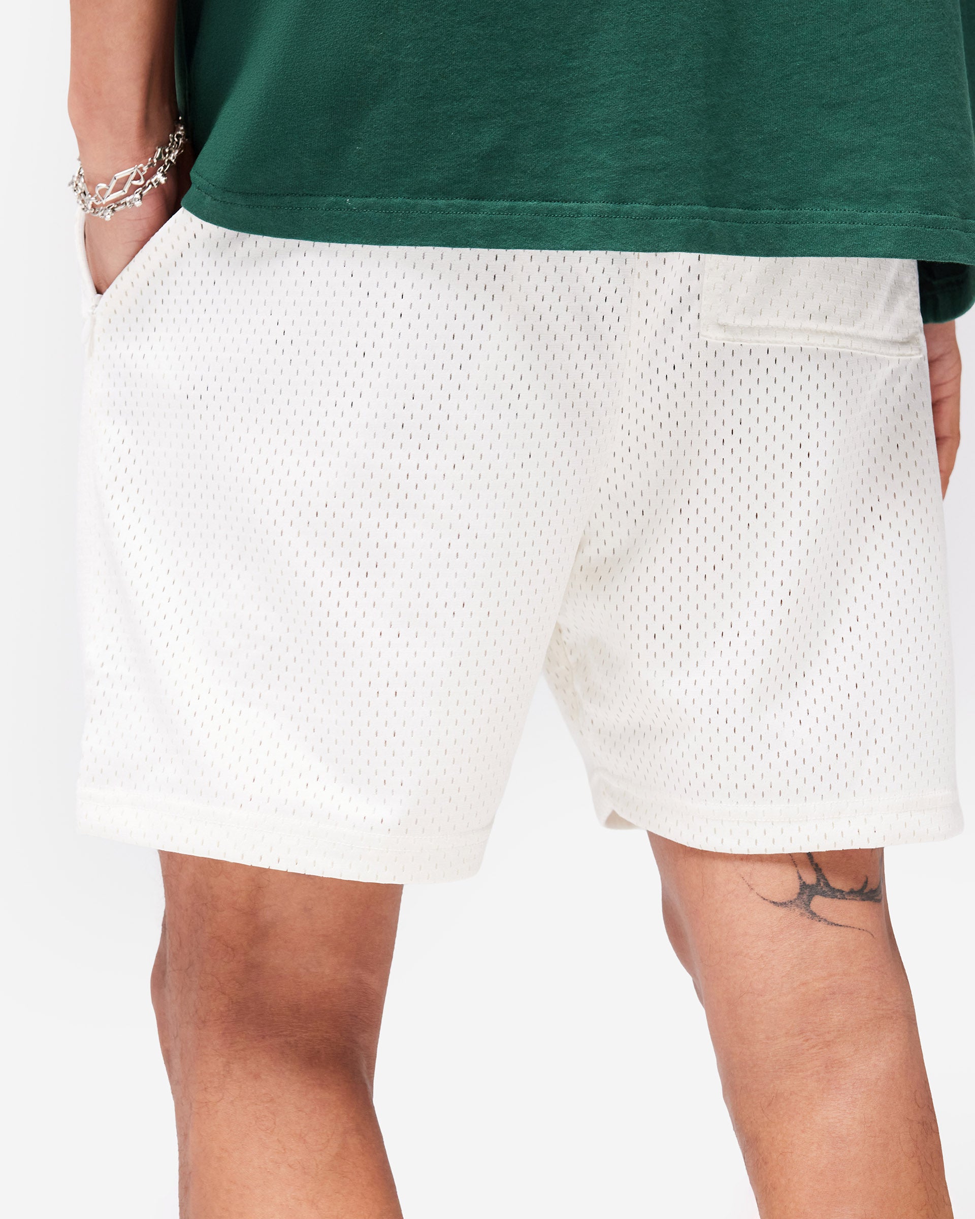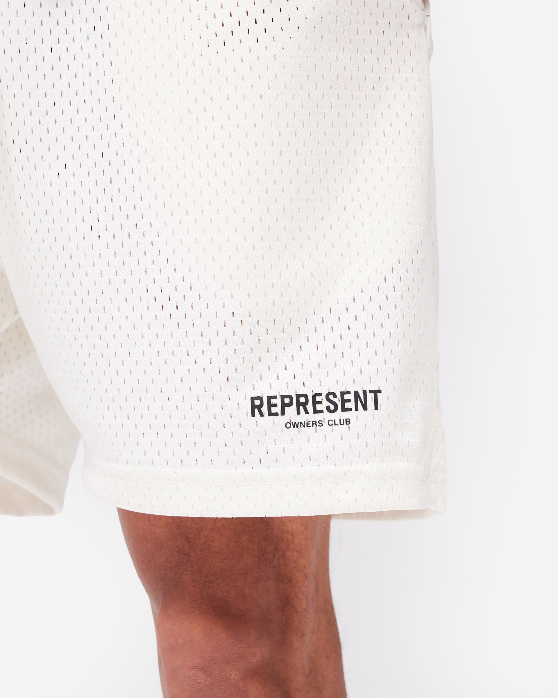 Represent Owners Club relaxed fit flat white mesh shorts. Welt pockets & an elasticated waist, with vintage white draw cords. Fully lined.