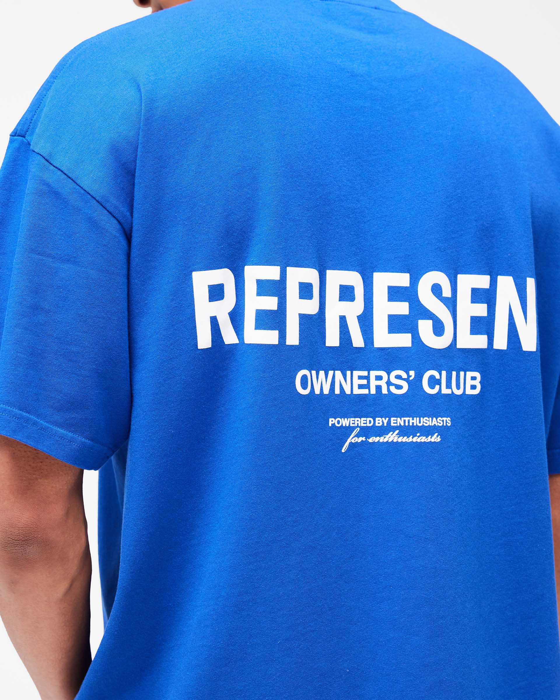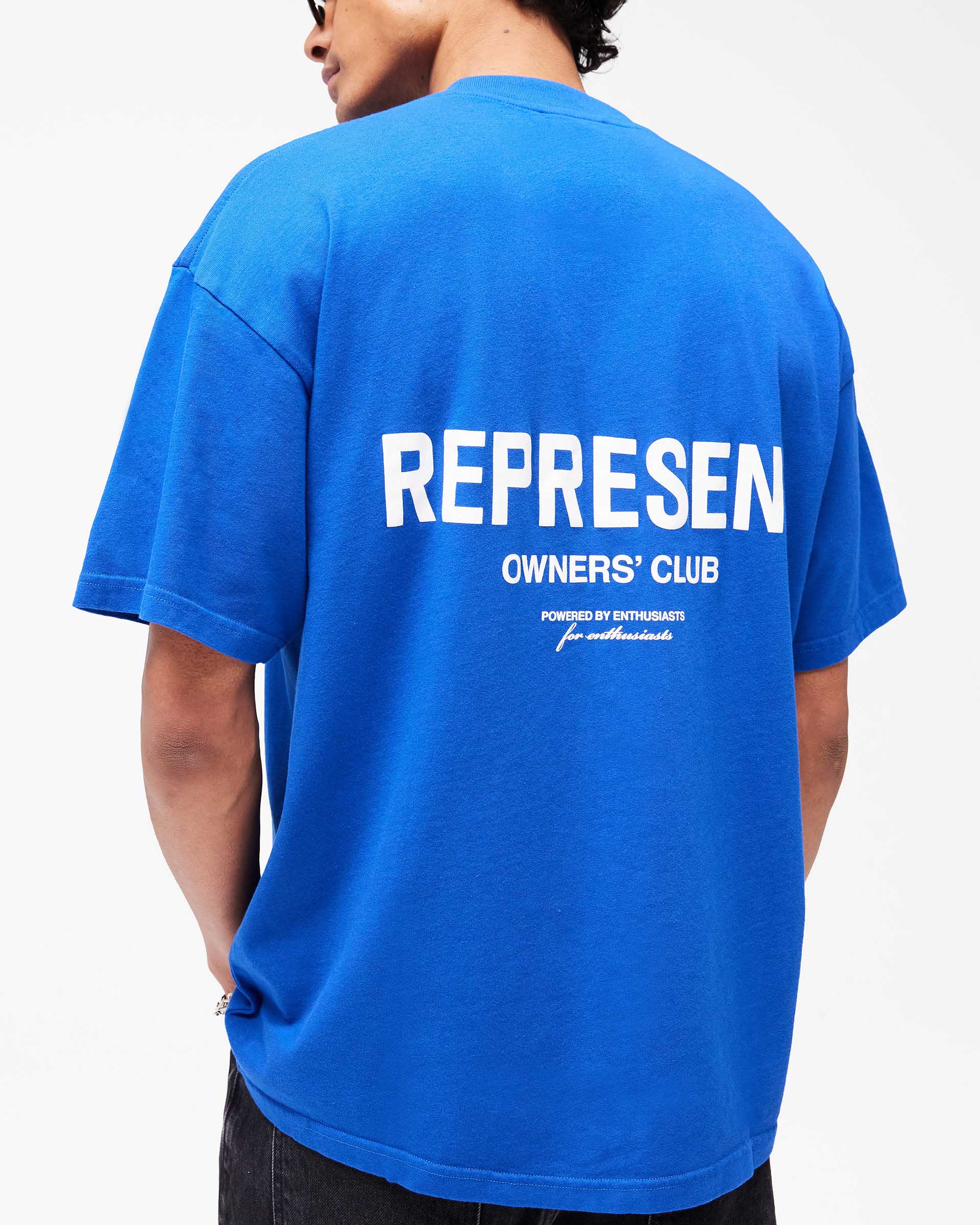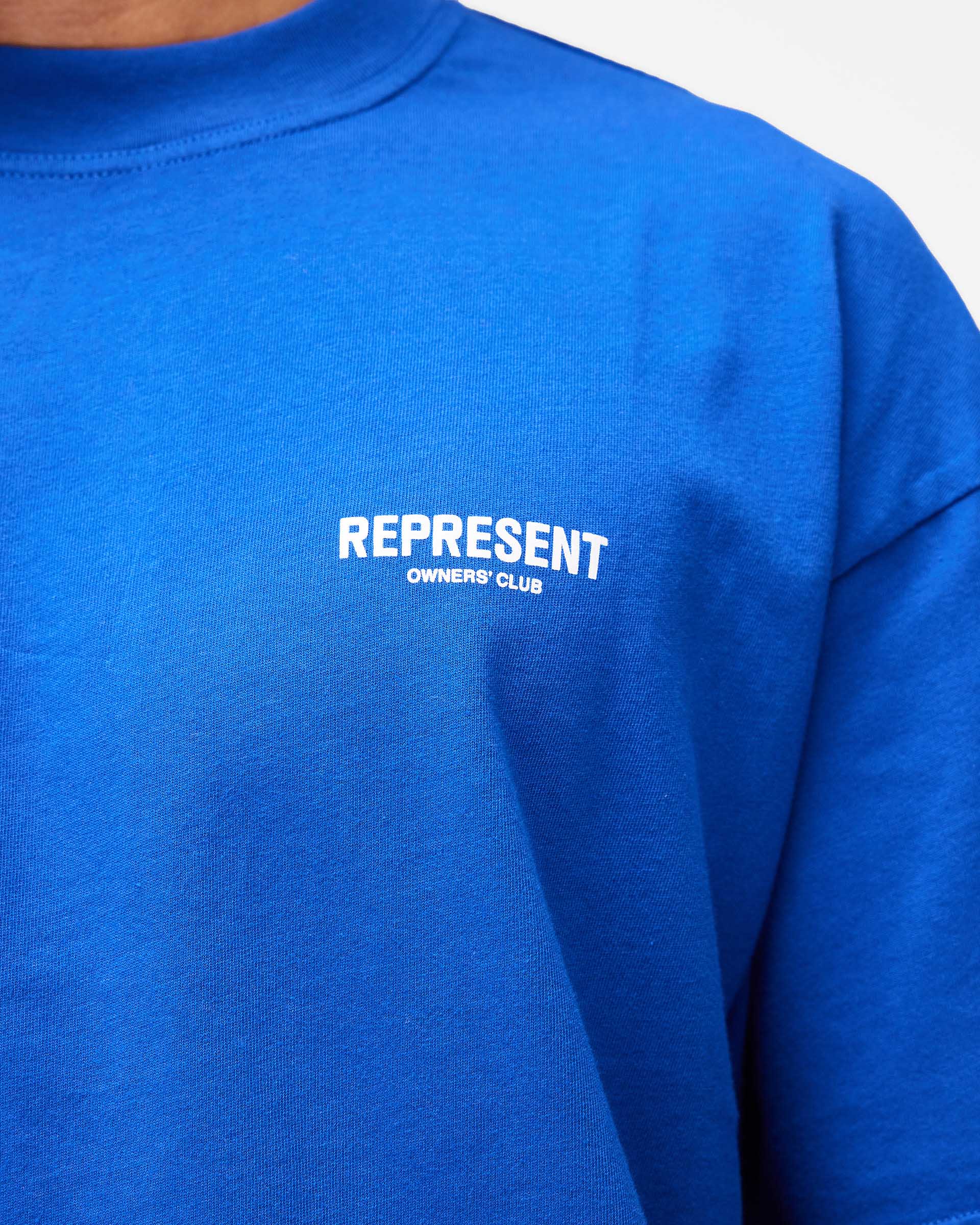 Introducing the Represent Owners Club T-Shirt in Cobalt. Our most recognised piece, born in Manchester and worn worldwide. Cut from 220gsm medium weight cotton, piece dyed for depth of colour and pre-shrunk for a consistent fit from the first wear. Owners Club branding sits to the chest and back with a Represent metal bar logo to the hem, finished with a ribbed crewneck collar and our signature oversized fit that falls wide and square. Made in Portugal.