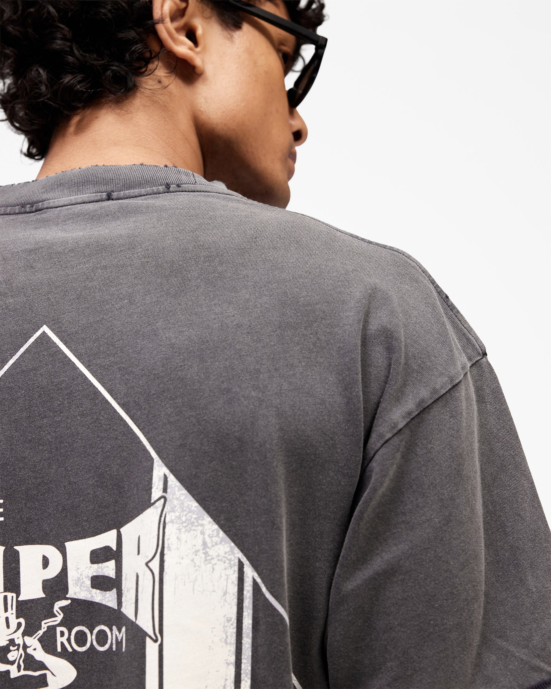 Craft details elevate this beyond a standard graphic tee. A signature metal bar anchors the hem, whilst ladder stitching at the cuff and hem adds intentional construction. Minimal distressing gives it a worn-in feel, and a gem stone embellishment on the back hem introduces a touch of unexpected luxury. It's designed to sit comfortably oversized, with a ribbed collar that grounds the silhouette.
