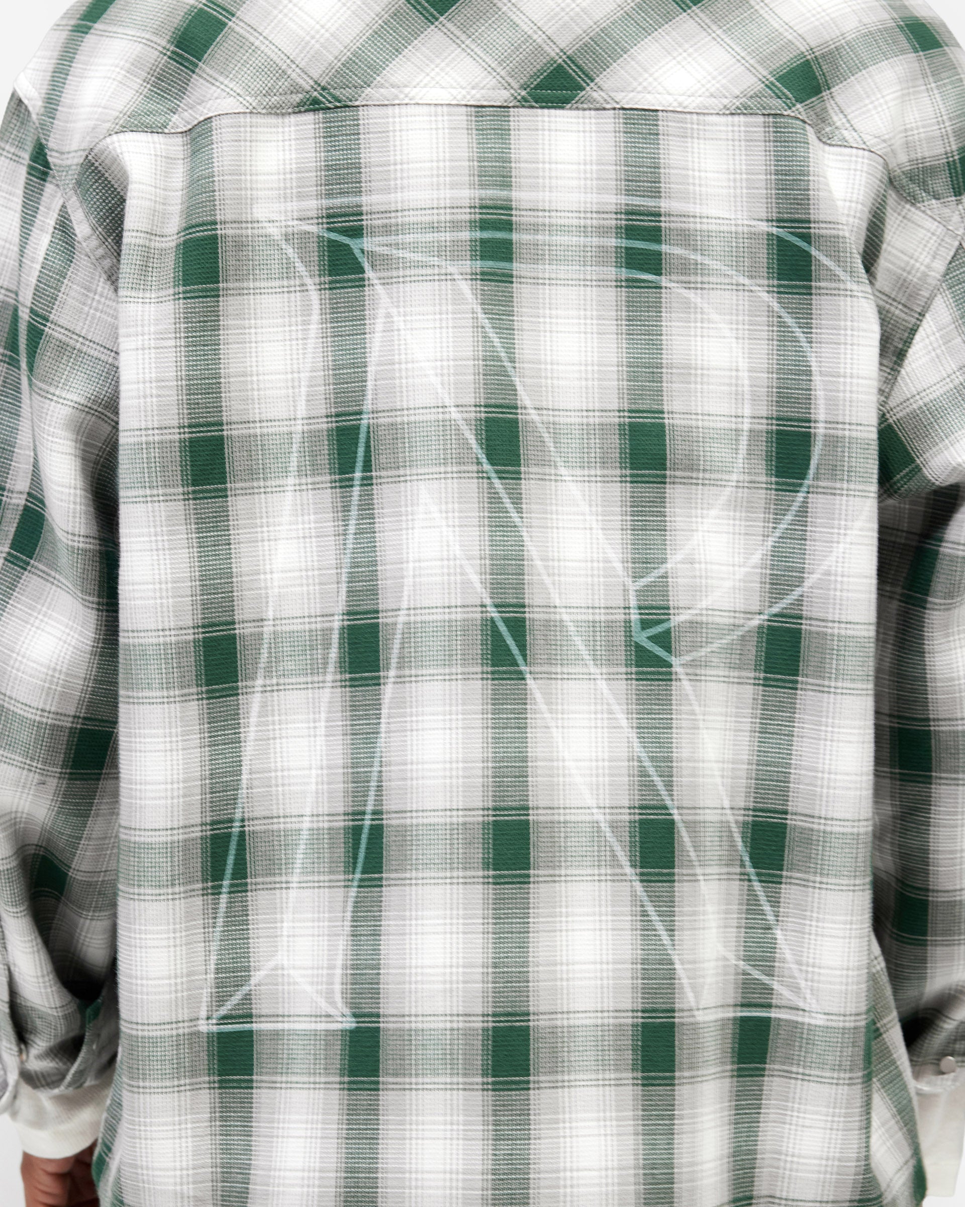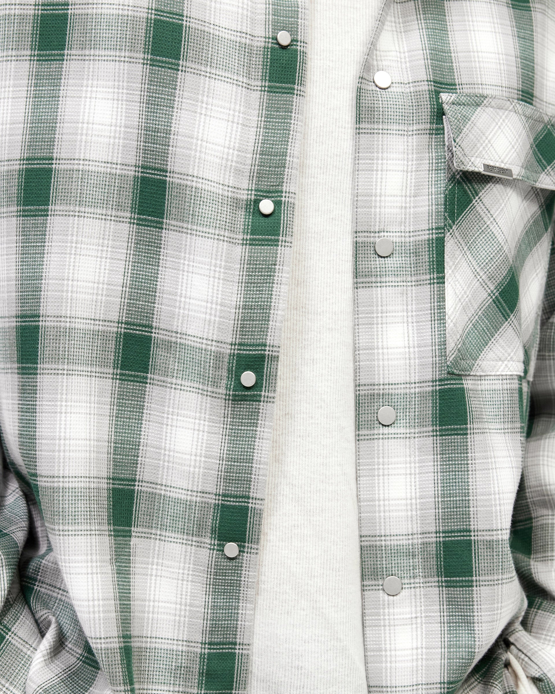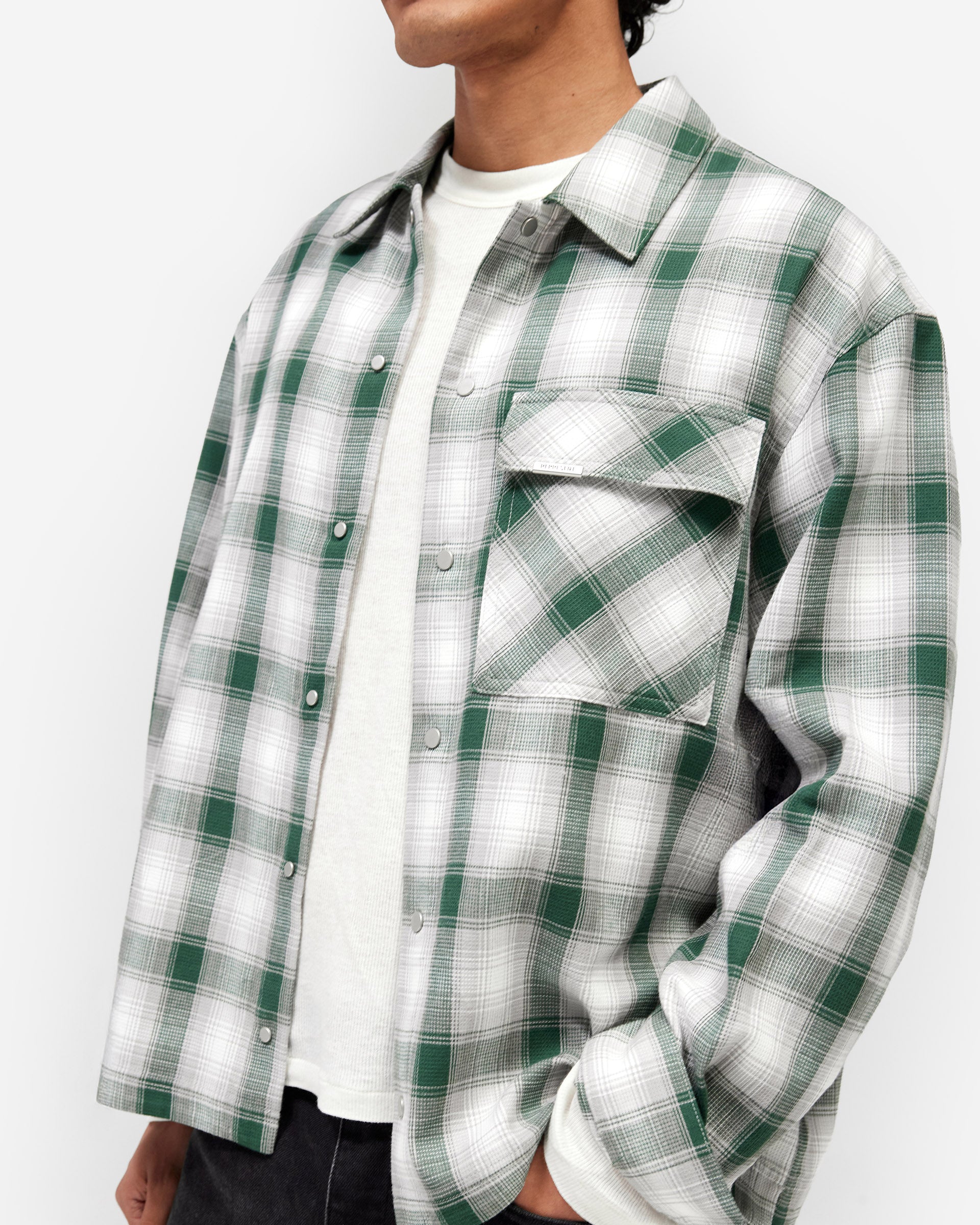 Introducing the Waffle Flannel in Dark Green, a relaxed flannel shirt crafted from a lightweight waffle-textured cotton in a green and white check pattern. The boxy, cropped silhouette sits clean at the waist with a relaxed drape through the body.